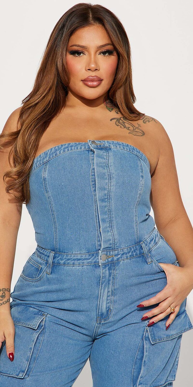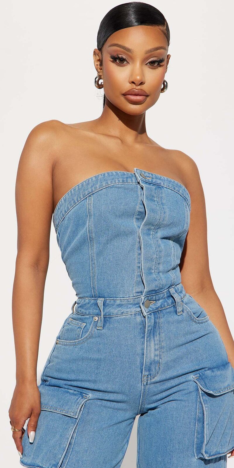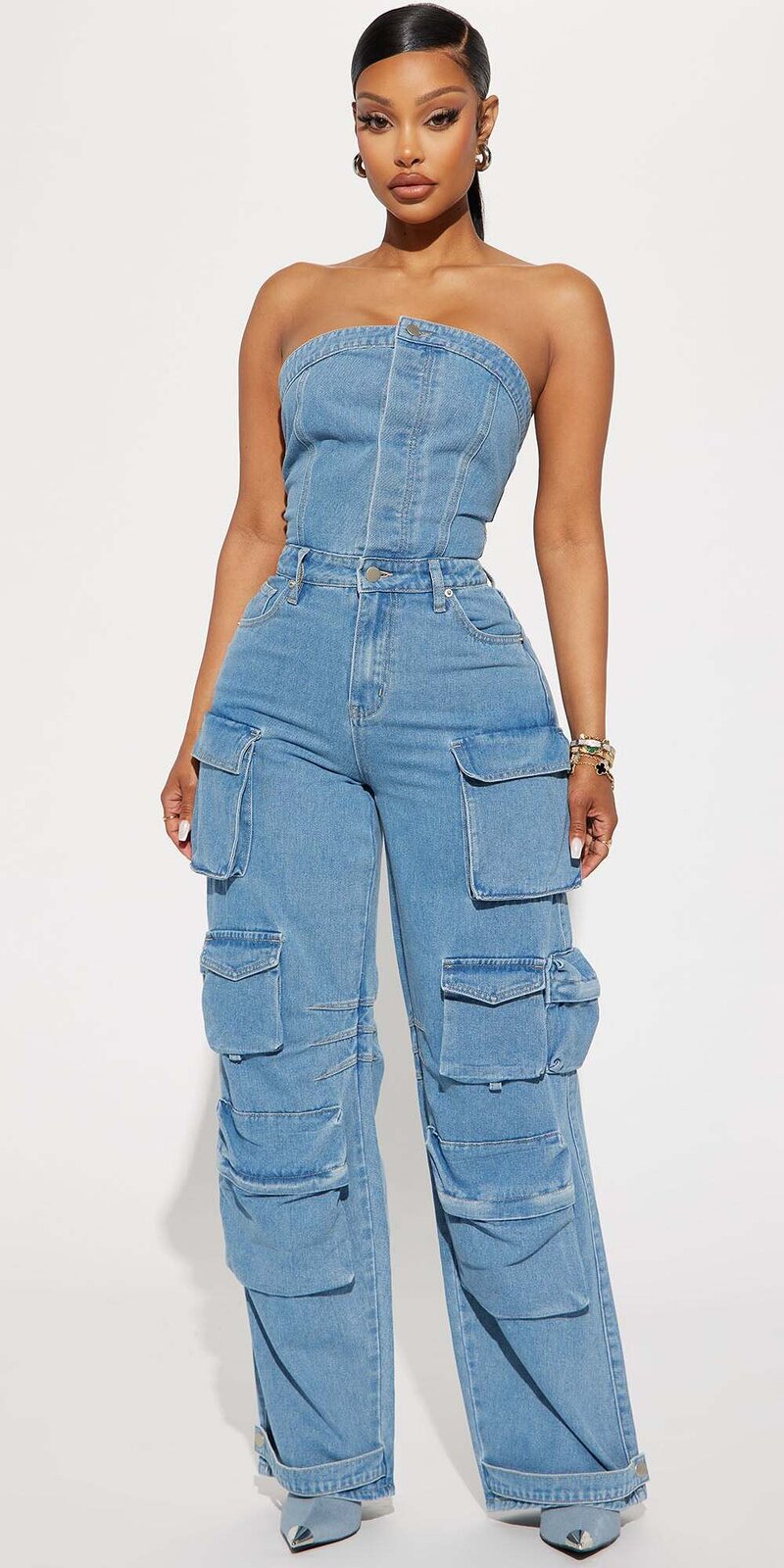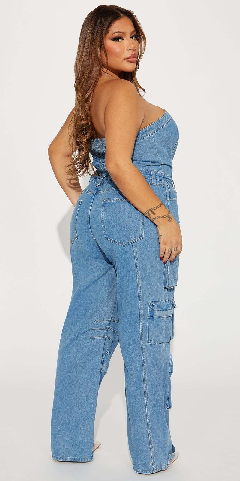 Štýlový rifľový overal v modrej farbe bez ramienok je moderným kúskom, ktorý zvýrazní ženskú postavu. Gombíkové zapínanie, cargo vrecká a široký strih nohavíc dopĺňajú elastické riasenie na chrbte pre pohodlné nosenie.