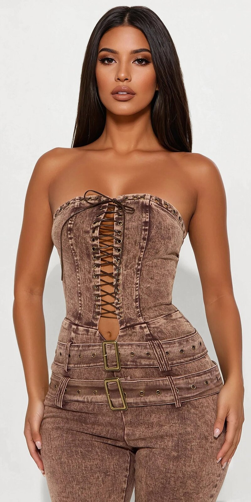 Rifľový overal s rozšírenými nohavicami a nastaviteľným pásom v hnedej farbe