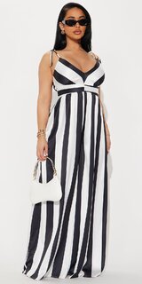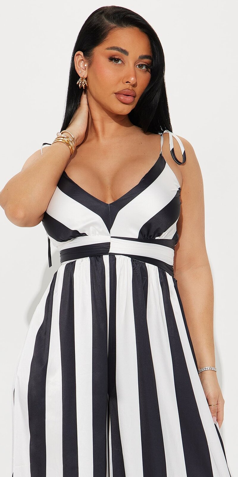 Elegantný saténový overal v čierno-bielej kombinácii s jemným leskom a decentným riasením. Má výstrih do V, viazanie na ramenách a mierne elastický materiál pre pohodlie pri nosení. Každý kus má originálne rozmiestnenie vzoru.