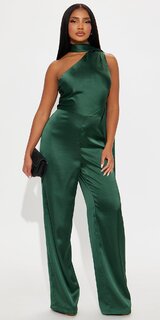 Saténový overal s halter výstrihom v tmavozelenej farbe
