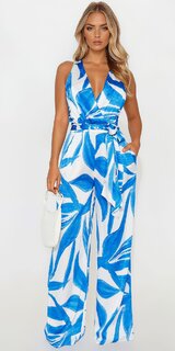 Saténový overal s viazaním v páse v modrom vzorovanom prevedení