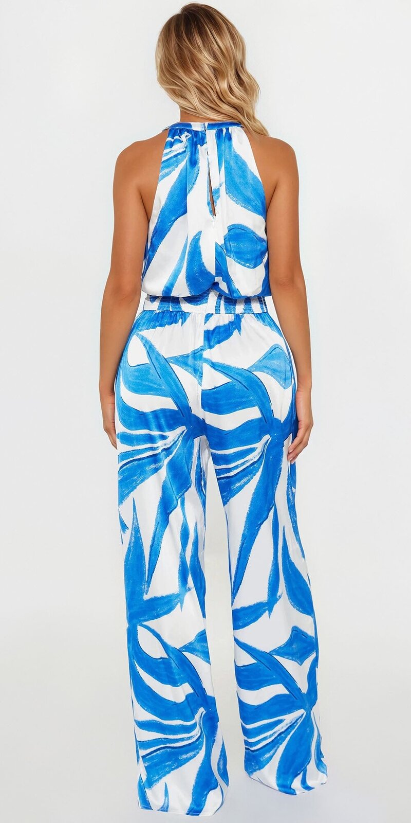 Overal má viazanie v páse, ktoré zvýrazňuje siluetu, a široké nohavice pre plynulý, vzdušný vzhľad. Skrytý zips na chrbte a elastický zadný diel zaručujú, že model perfektne sadne a pritom zostáva pohodlný.