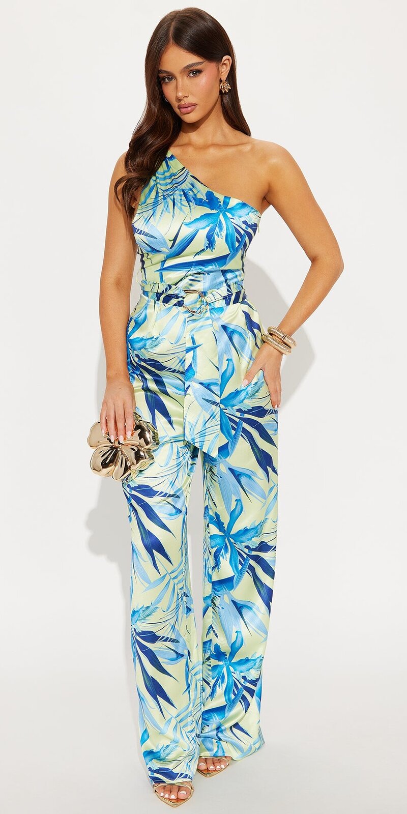 Elegantný saténový overal v modrom vzorovanom prevedení so širokými nohavicami. Lichotivý strih a jemne lesklý materiál vytvárajú luxusný vzhľad, ideálny na spoločenské či dovolenkové príležitosti. Horný diel je podšitý pre väčšie pohodlie.