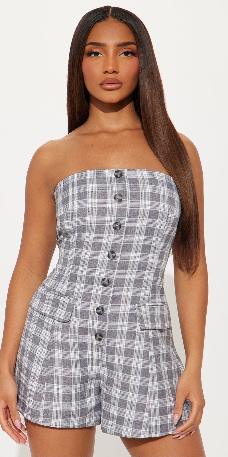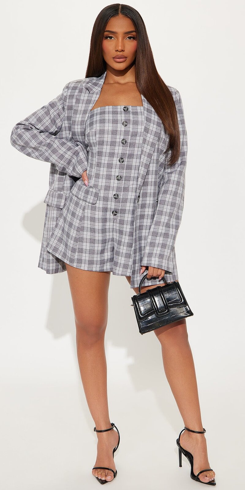 Kombinácia overalu a blejzra v jednom kuse pôsobí originálne, pričom zachováva pohodlie pri nosení. Rovný strih šortiek a decentný károvaný vzor v sivej farbe podčiarkujú profesionálny, no zároveň ženský charakter modelu.