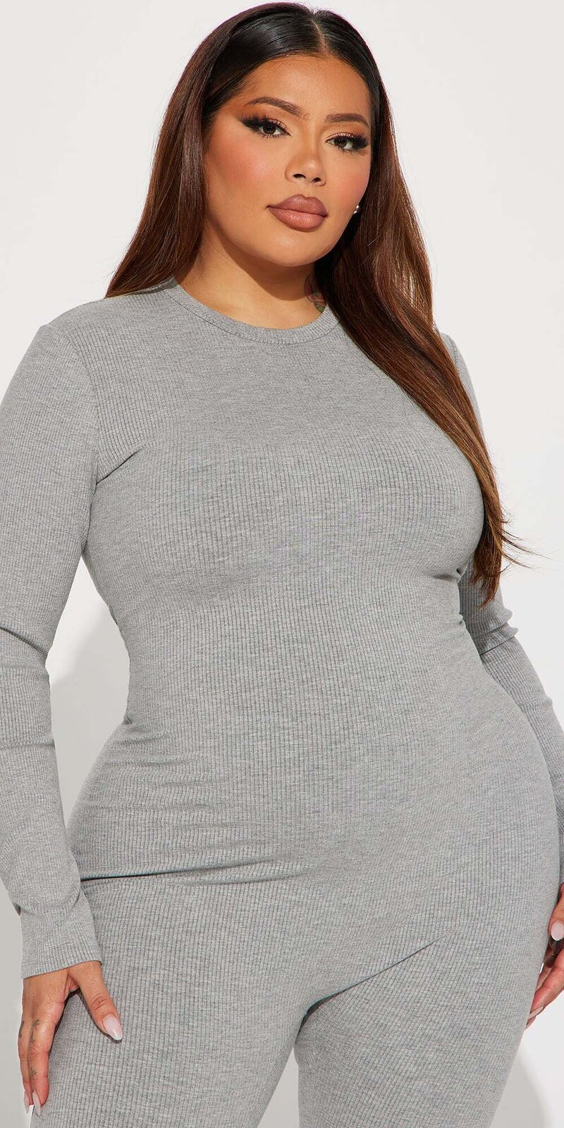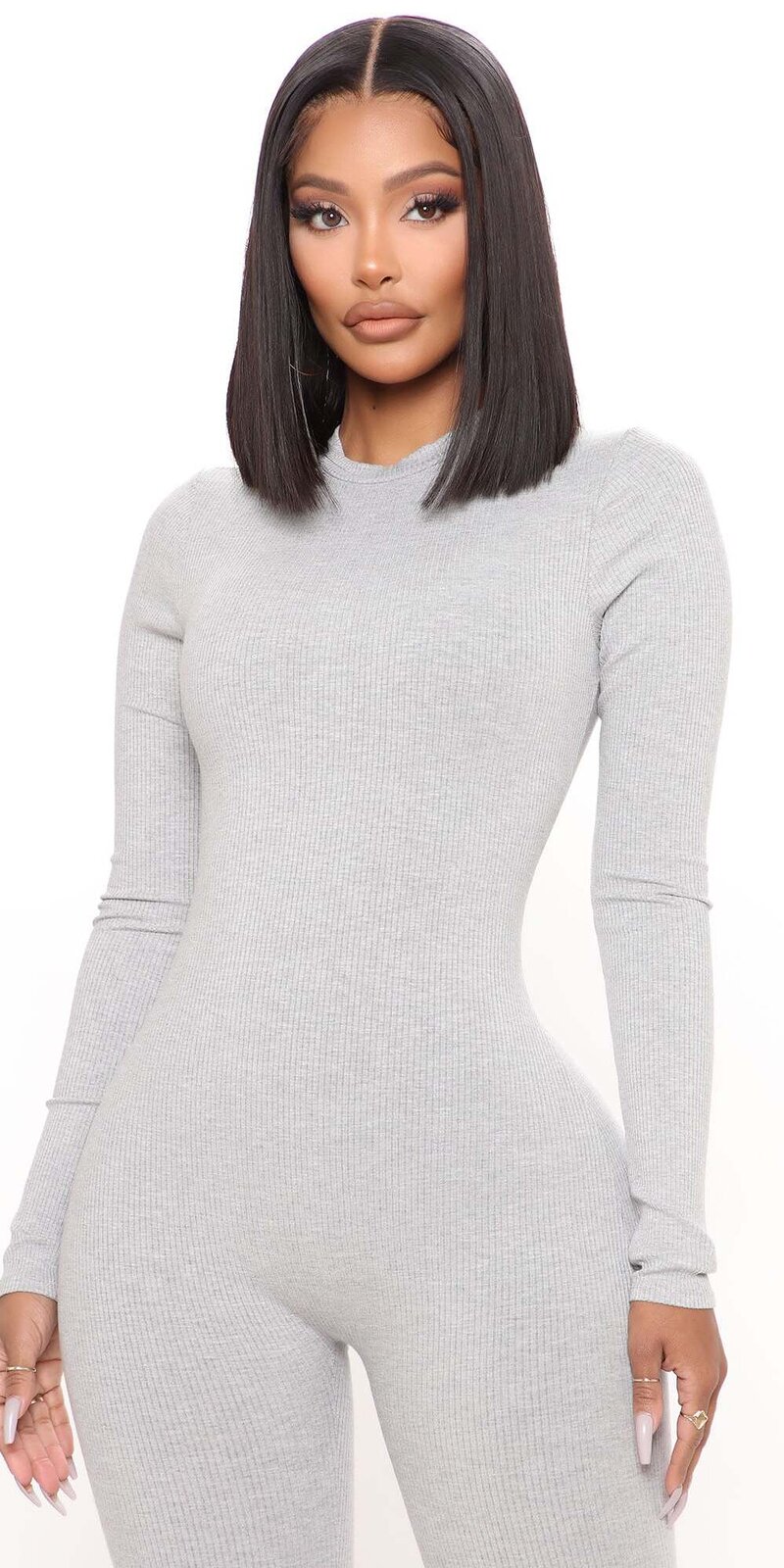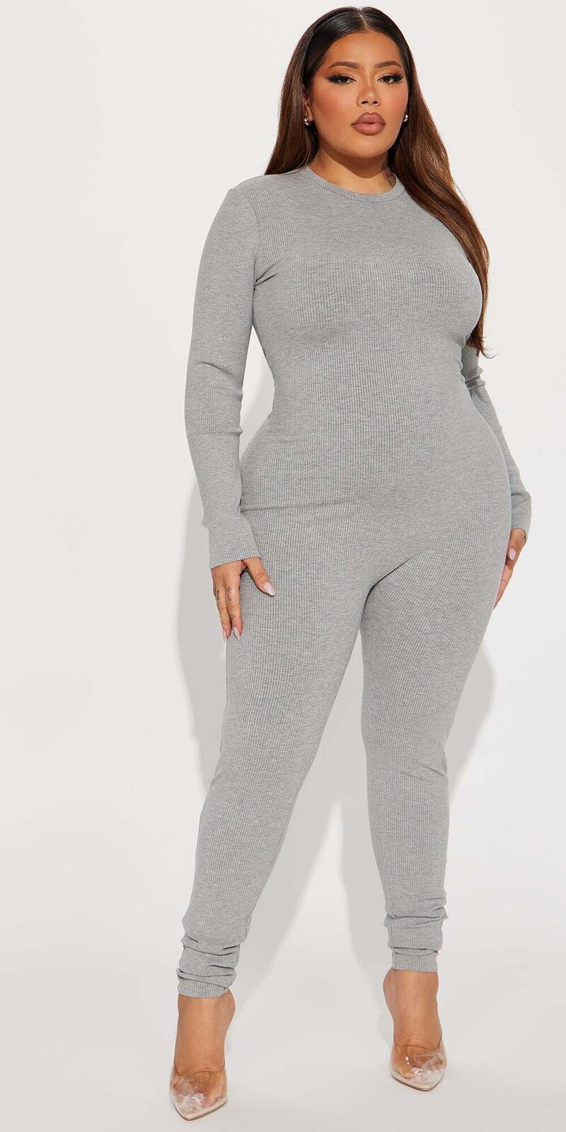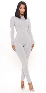 Moderný priliehavý overal v svetlo sivej farbe z rebrovaného kompresného materiálu dokonale zvýrazňuje postavu. Vysoký golier a zapínanie na zips vzadu podčiarkujú elegantný vzhľad, zatiaľ čo elastická tkanina zabezpečuje pohodlie pri nosení.