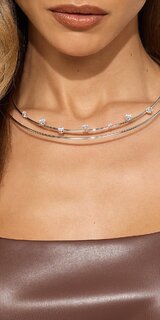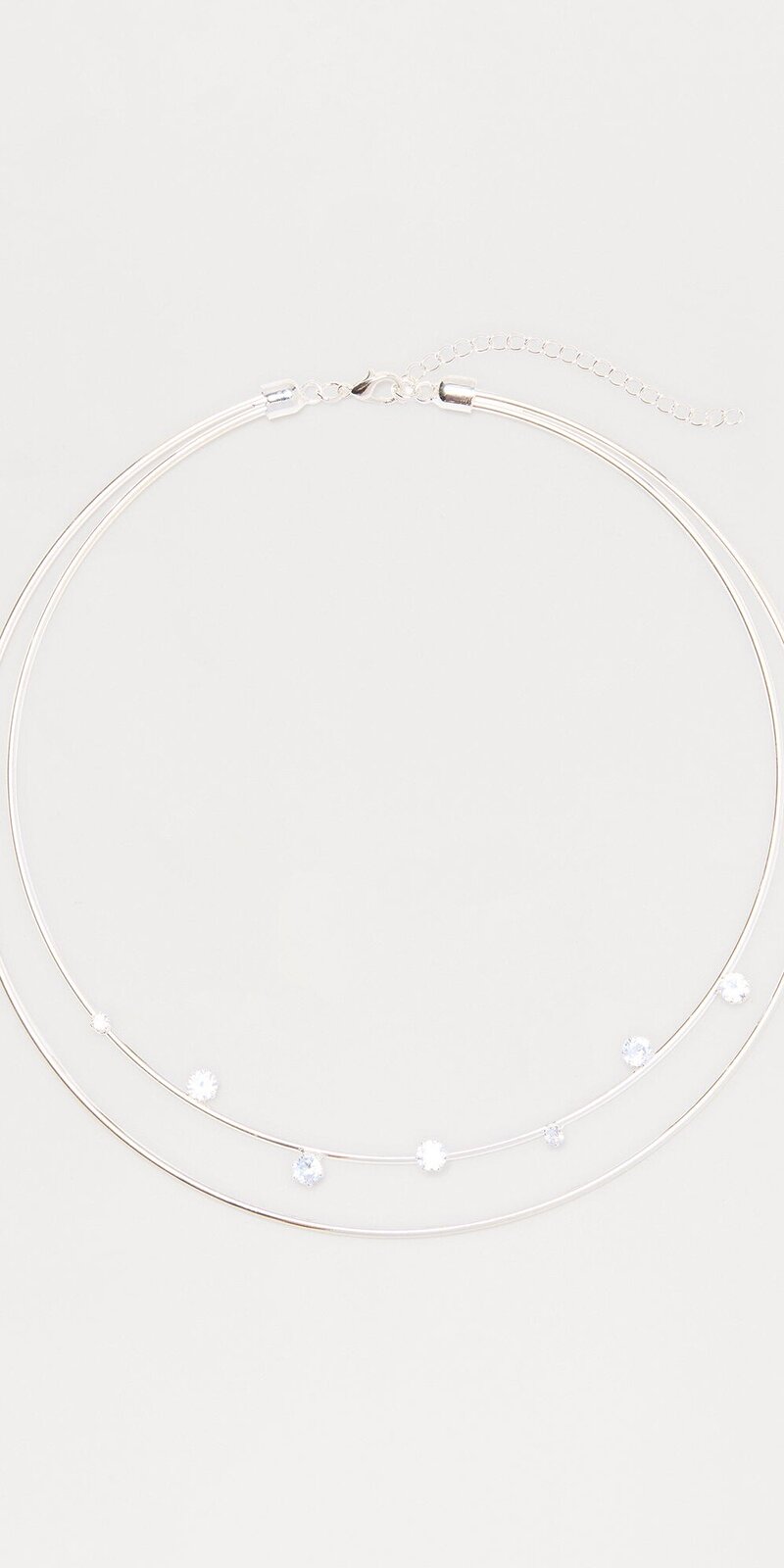 Elegantný choker náhrdelník v striebornej farbe upúta jemným radením trblietavých kamienkov, ktoré vytvárajú luxusný a sofistikovaný efekt. Hladký, lesklý povrch pôsobí uhladene a je príjemný na nosenie tesne pri krku.
