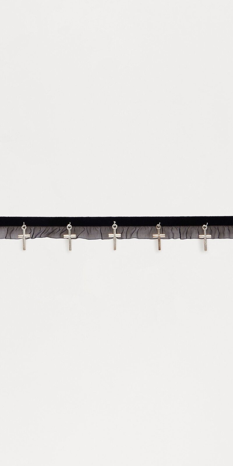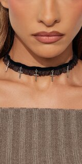 Štýlový čierny choker z jemnej látky dopĺňa elegantný prívesok v tvare krížika, ktorý dodáva doplnku moderný a mierne rebelský akcent. Mäkký textilný povrch je príjemný na pokožke a ľahko sa prispôsobí krku, zatiaľ čo kovové detaily pôsobia luxusne. Zapínanie na karabínku umožňuje presné nastavenie dĺžky.