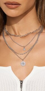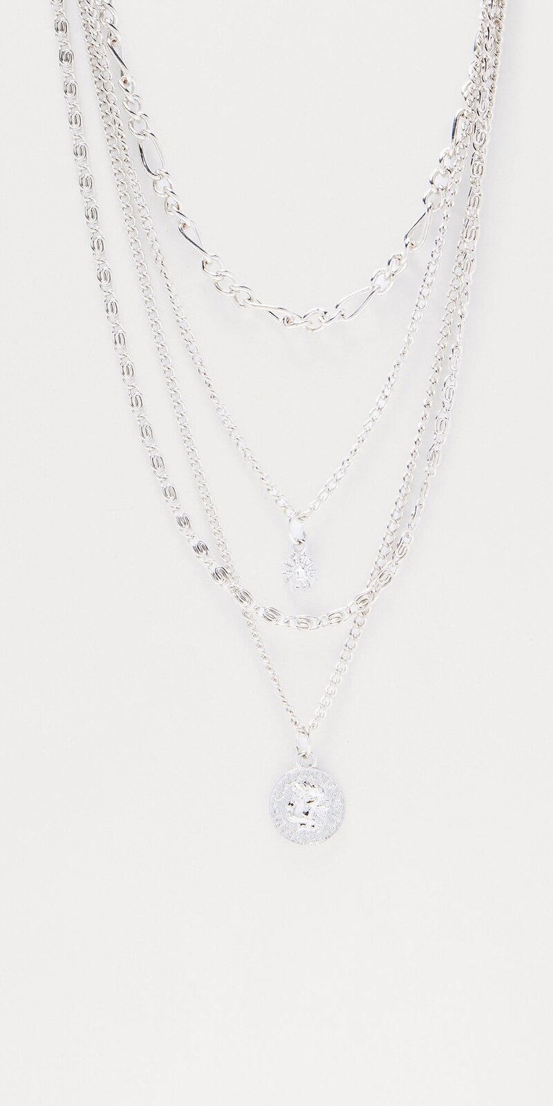 Elegantný vrstvený náhrdelník v striebornej farbe, ktorý zaujme jemným leskom a harmonickou kombináciou príveskov. Hladký kovový povrch dopĺňa mincový detail a trblietavé kamienky, vďaka čomu pôsobí šperk luxusne, no zároveň jemne a moderne.