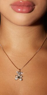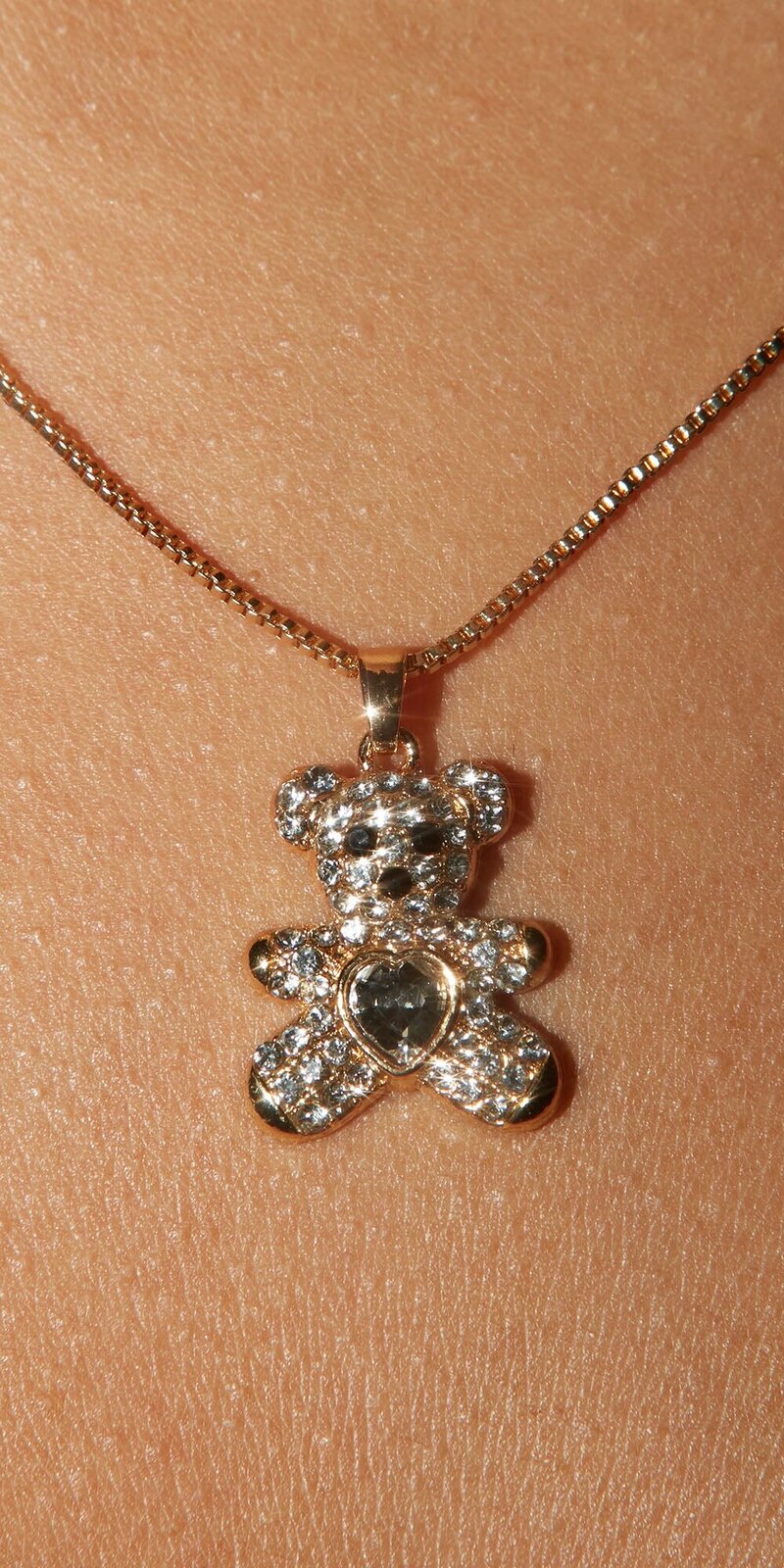 Rozkošný zlatý náhrdelník zdobí jemný medvedíkový prívesok doplnený o srdiečkový akcent a trblietavé kamienky. Lesklý kovový povrch pôsobí elegantne a príjemná ľahká retiazka zabezpečuje komfortné nosenie. Zapínanie na karabínku ponúka spoľahlivé uchytenie.