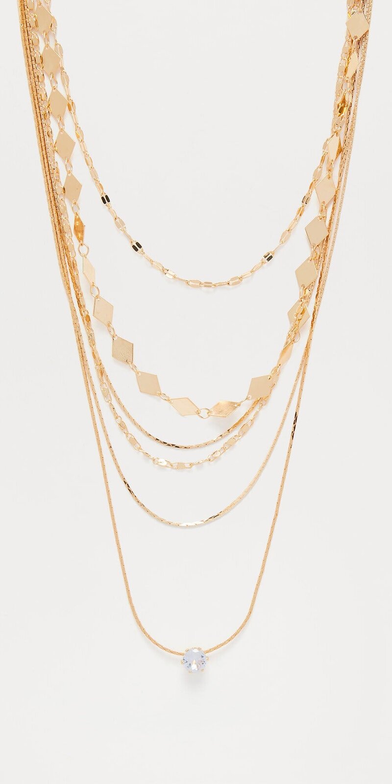 Elegantný zlatý vrstvený náhrdelník zdobia rôzne jemné prívesky doplnené žiarivými kamienkami. Viacvrstvový dizajn vytvára harmonický a moderný efekt, zatiaľ čo lesklý kovový povrch pôsobí luxusne. Zapínanie na karabínku zaručuje pohodlné a spoľahlivé nosenie.