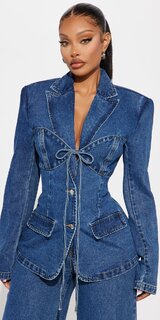 Džínsové sako s viazaním v páse v modrom odtieni