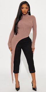Elegantný sveter v hnedej farbe zaujme moderným asymetrickým lemom a jemným rolákom, ktorý pôsobí sofistikovane. Mäkký úplet s podielom viskózy je hebký na dotyk, príjemne hrejivý a vďaka pružnosti sa pohodlne prispôsobí postave.