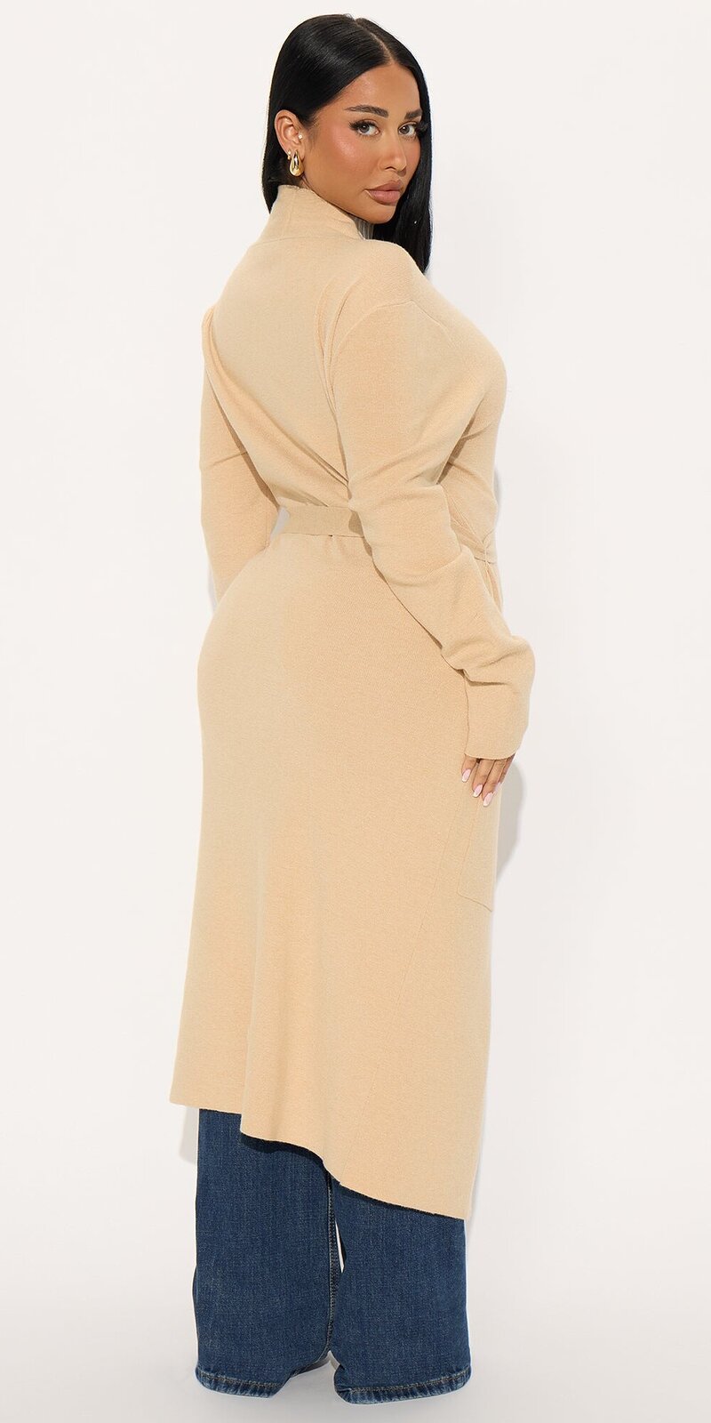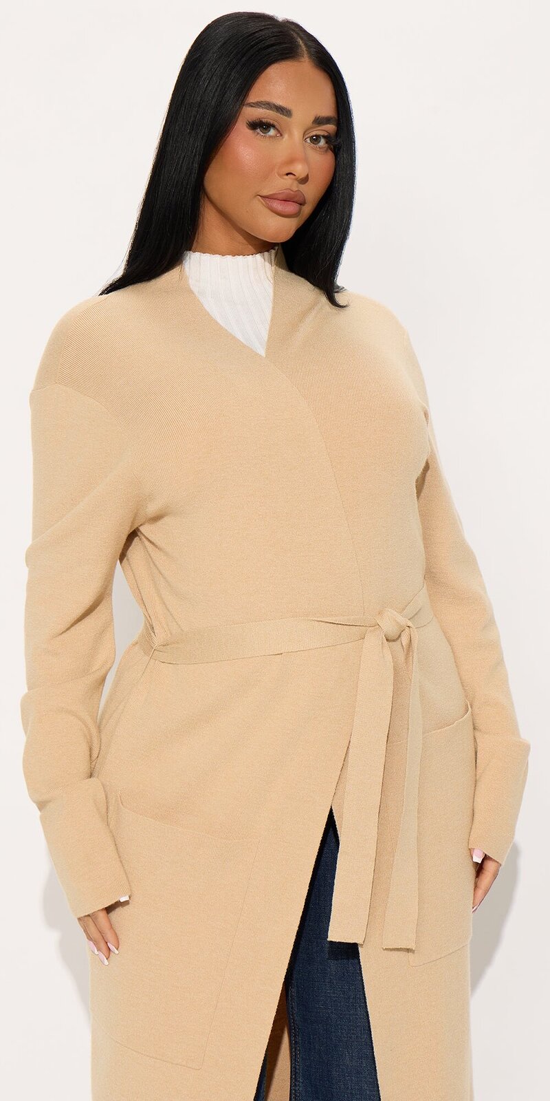 Elegantný kardigán v béžovej farbe s otvoreným strihom, ktorý pôsobí mäkko, hrejivo a príjemne na dotyk. Jemný úplet s hladkým povrchom dopĺňa odnímateľný opasok a praktické vrecká, vďaka čomu vytvára uhladený, no zároveň pohodlný vzhľad.