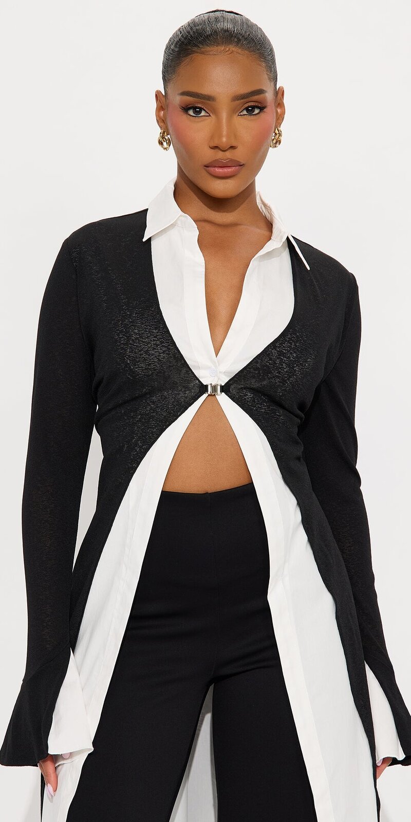 Elegantný kardigán s golierom a prackou v čierno-bielej kombinácii