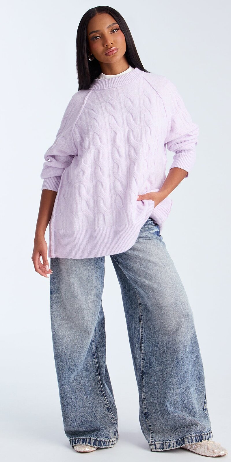 Štýlový sveter v jemnej fialovej farbe zaujme výrazným vrkočovým vzorom a mäkkou pletenou štruktúrou. Hebký úplet je príjemný na dotyk, hrejivý a pružný, takže poskytuje komfort počas celého dňa.