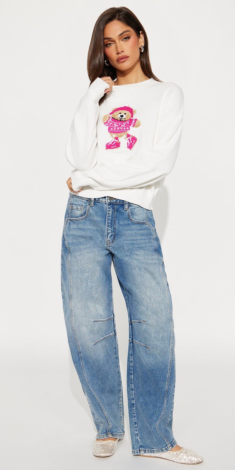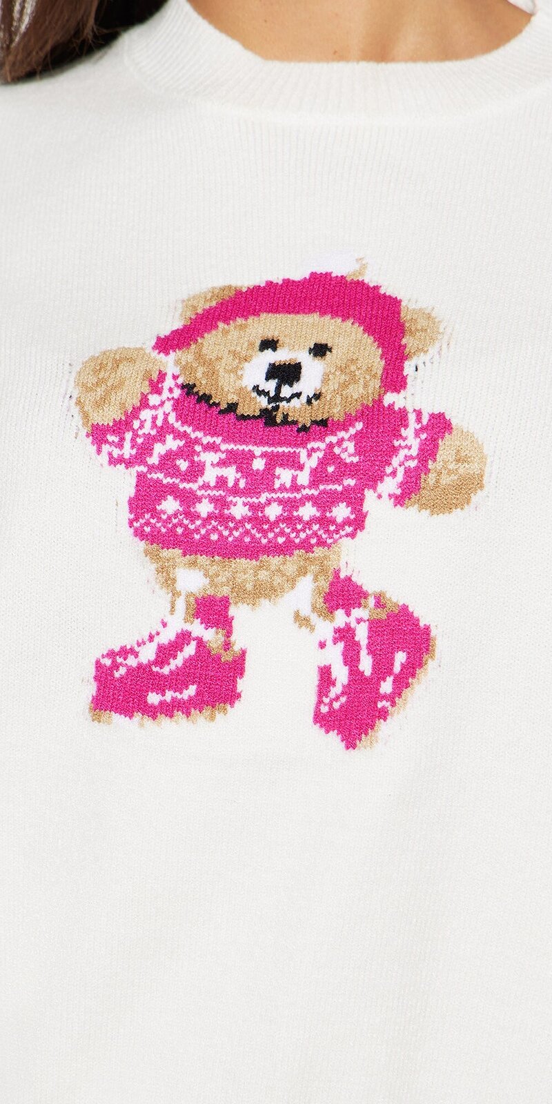 Štýlový skrátený sveter v béžovej farbe zaujme hravým grafickým motívom a moderným strihom. Mäkký úplet je hebký na dotyk, príjemne zahreje a vďaka pružnosti sa pohodlne prispôsobí postave.