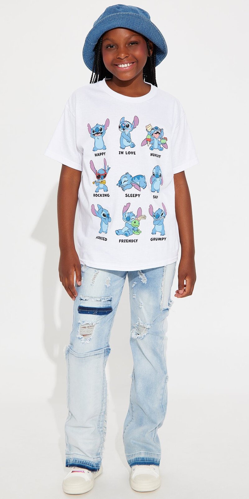Roztomilé biele tričko s krátkym rukávom a okrúhlym výstrihom. Predná strana zdobená potlačou s postavičkou Stitch a rôznymi náladami. Vyrobené zo 100 % bavlny, ktorá je mäkká, priedušná a príjemná na pokožku.