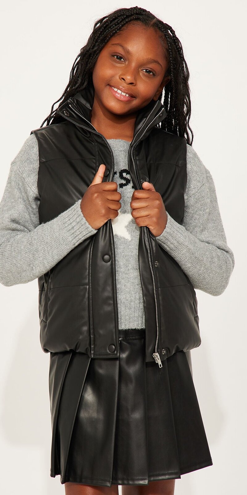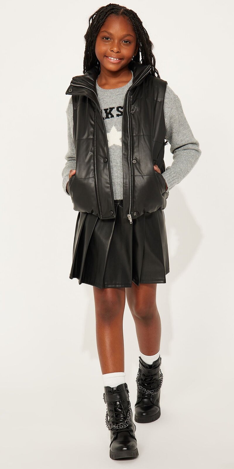 Táto čierna detská vesta z umelej kože predstavuje ideálnu kombináciu módneho dizajnu a praktickosti. Je ľahká, hrejivá a dodá každému outfitu moderný mestský vzhľad.
