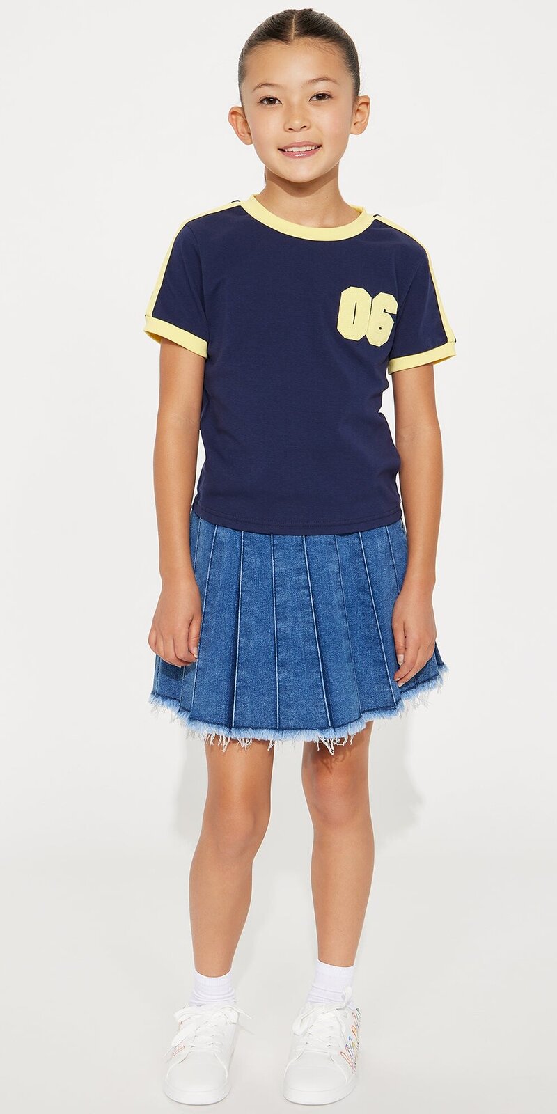 Mini sukňa Helen v stredne modrej rifľovej farbe kombinuje klasický denimový vzhľad s dievčenským skladaným strihom. Je ideálna pre každodenné nosenie, do školy aj na voľný čas.