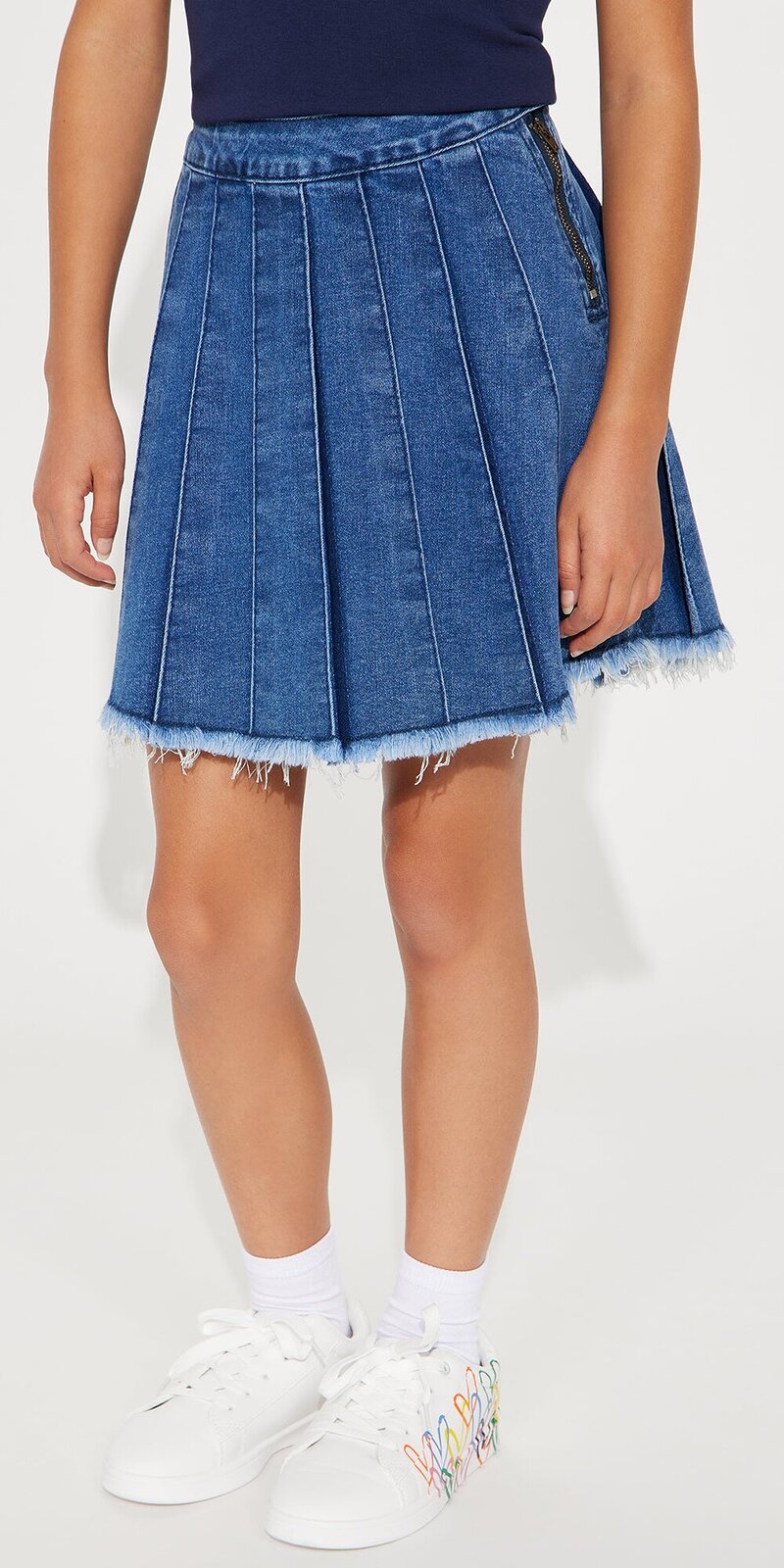 Štýlová detská rifľová mini sukňa Helen v stredne modrom odtieni s jemným skladaným strihom. Kvalitný denim s malou pružnosťou poskytuje pohodlie a voľnosť pohybu. Ideálna na každodenné nosenie aj školské outfity.