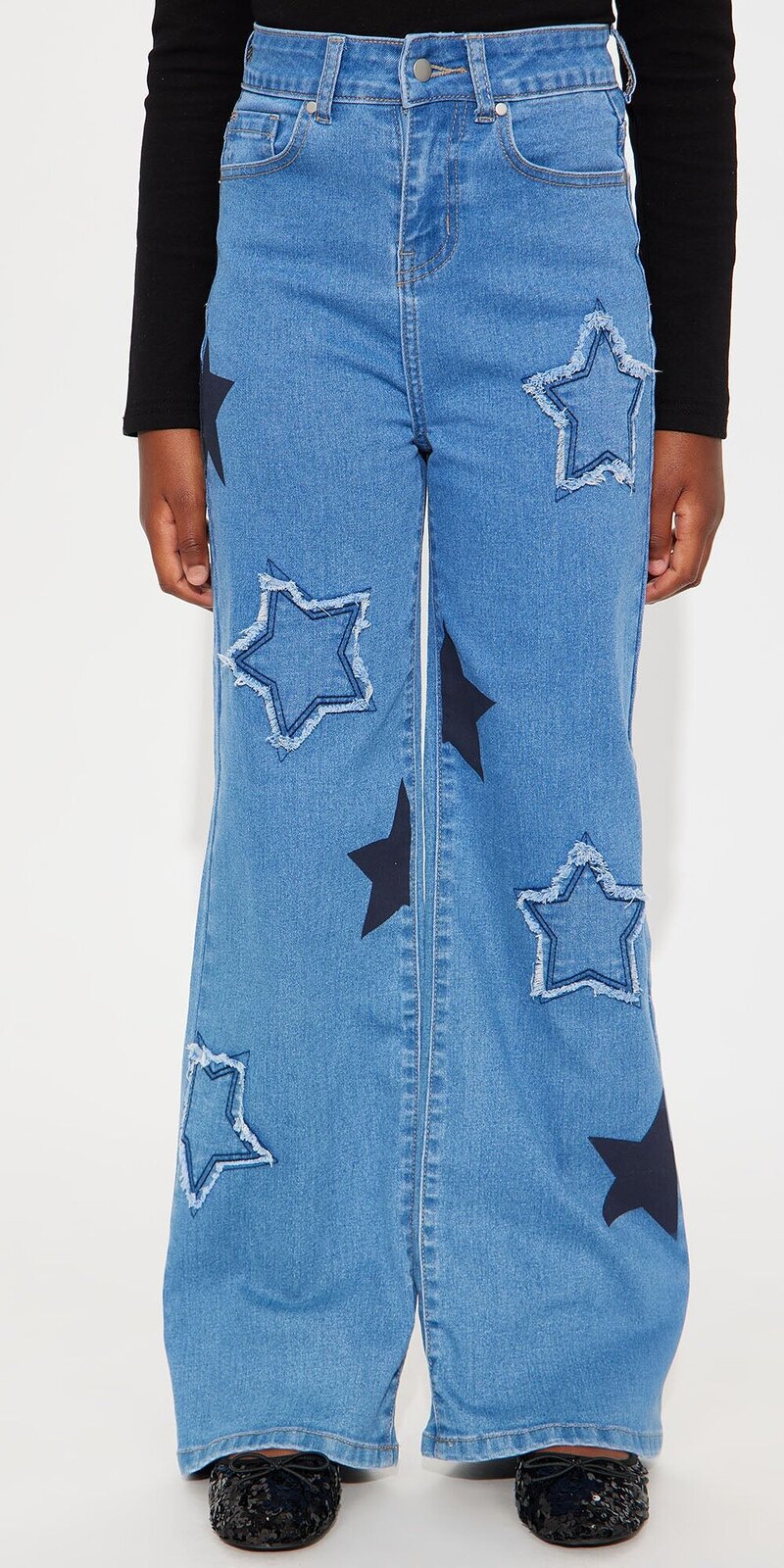 Štýlové detské rifle v stredne modrom odtieni s potlačou hviezd a jemne strapkatými lemami. Pružný denim poskytuje pohodlie pri pohybe a trendový vzhľad na každý deň.