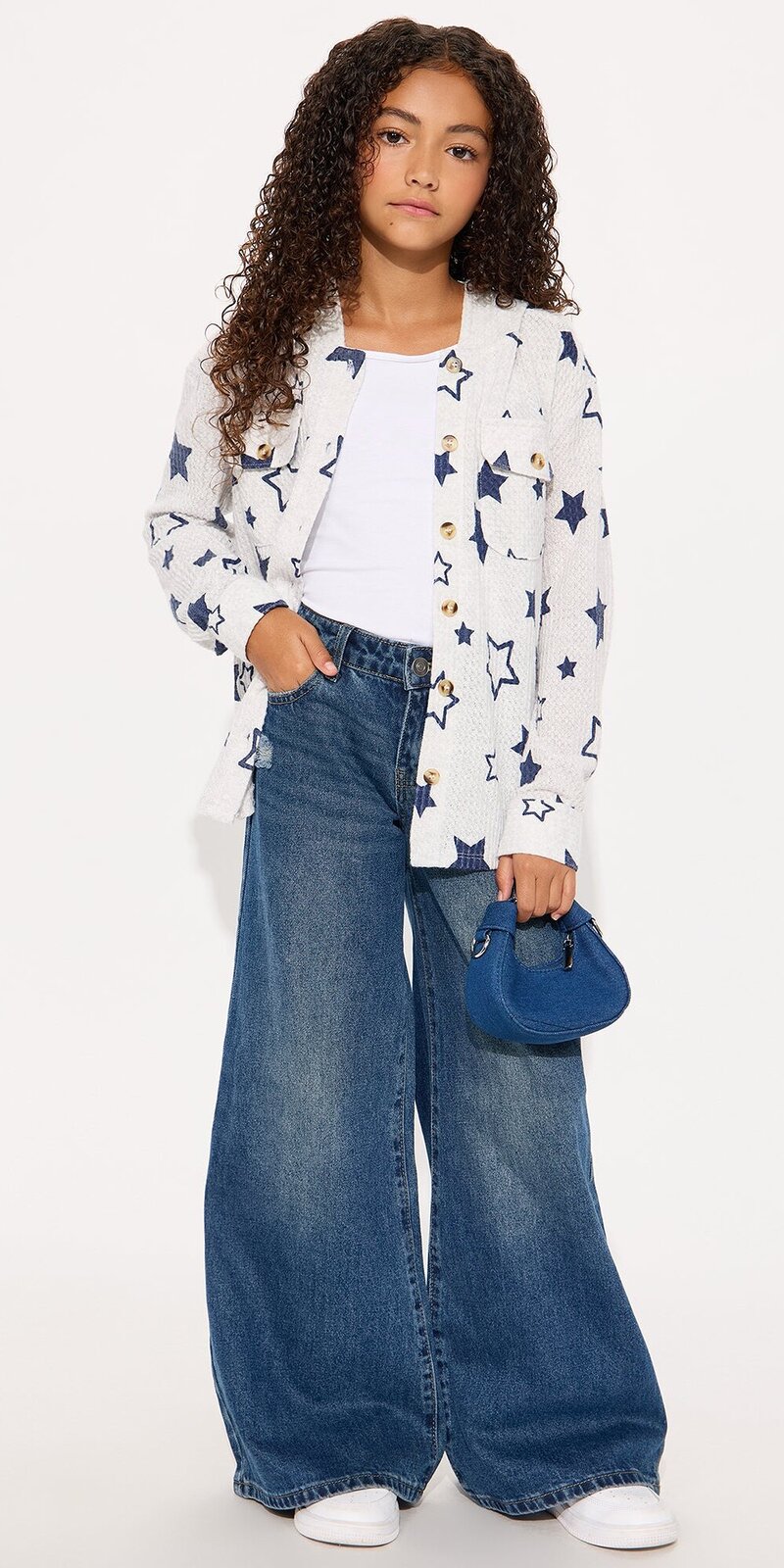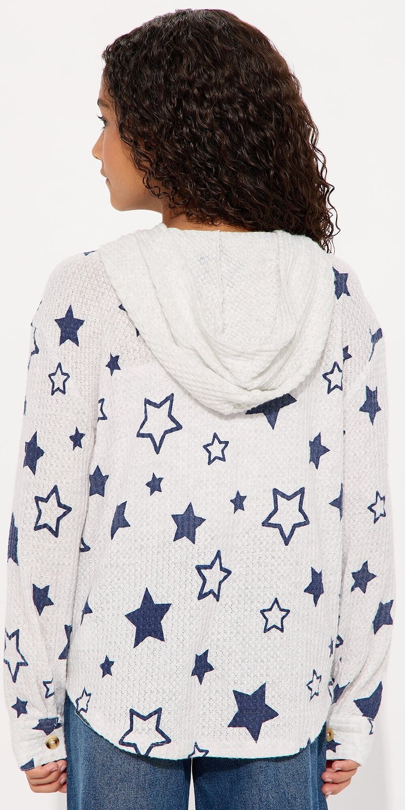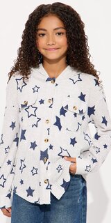 Štýlová mikinová bunda v šedej farbe zaujme originálnym hviezdnym vzorom a praktickým zapínaním na gombíky. Mäkký, jemne pružný materiál je hladký a príjemný na dotyk, vďaka čomu poskytuje komfort pri každodennom nosení.