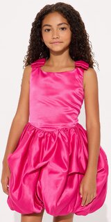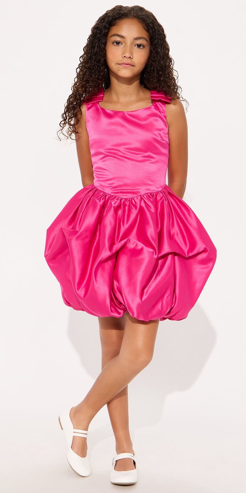 Výrazné mini šaty v ružovej farbe zaujmú elegantným lesklým povrchom a efektným balónovým lemom, ktorý dodáva modelu hravý, no luxusný charakter. Hladký, pevnejší materiál je príjemný na dotyk, krásne drží tvar a pôsobí výnimočne pri každom pohybe.