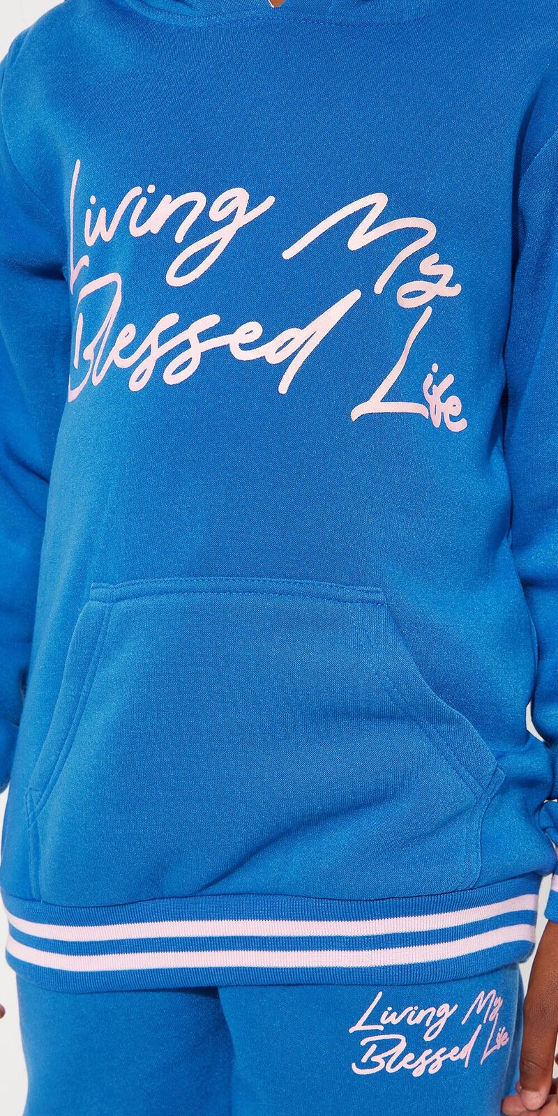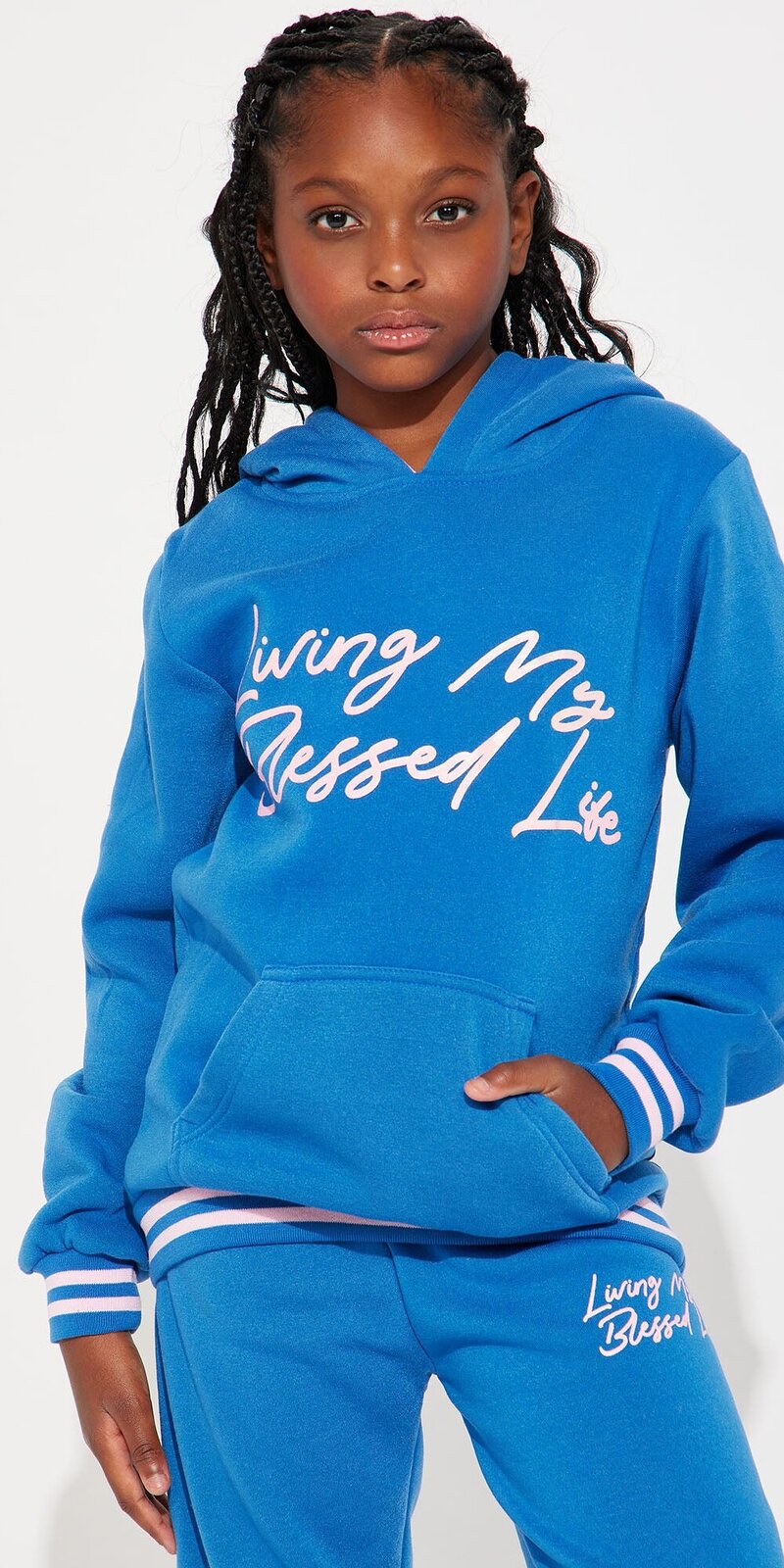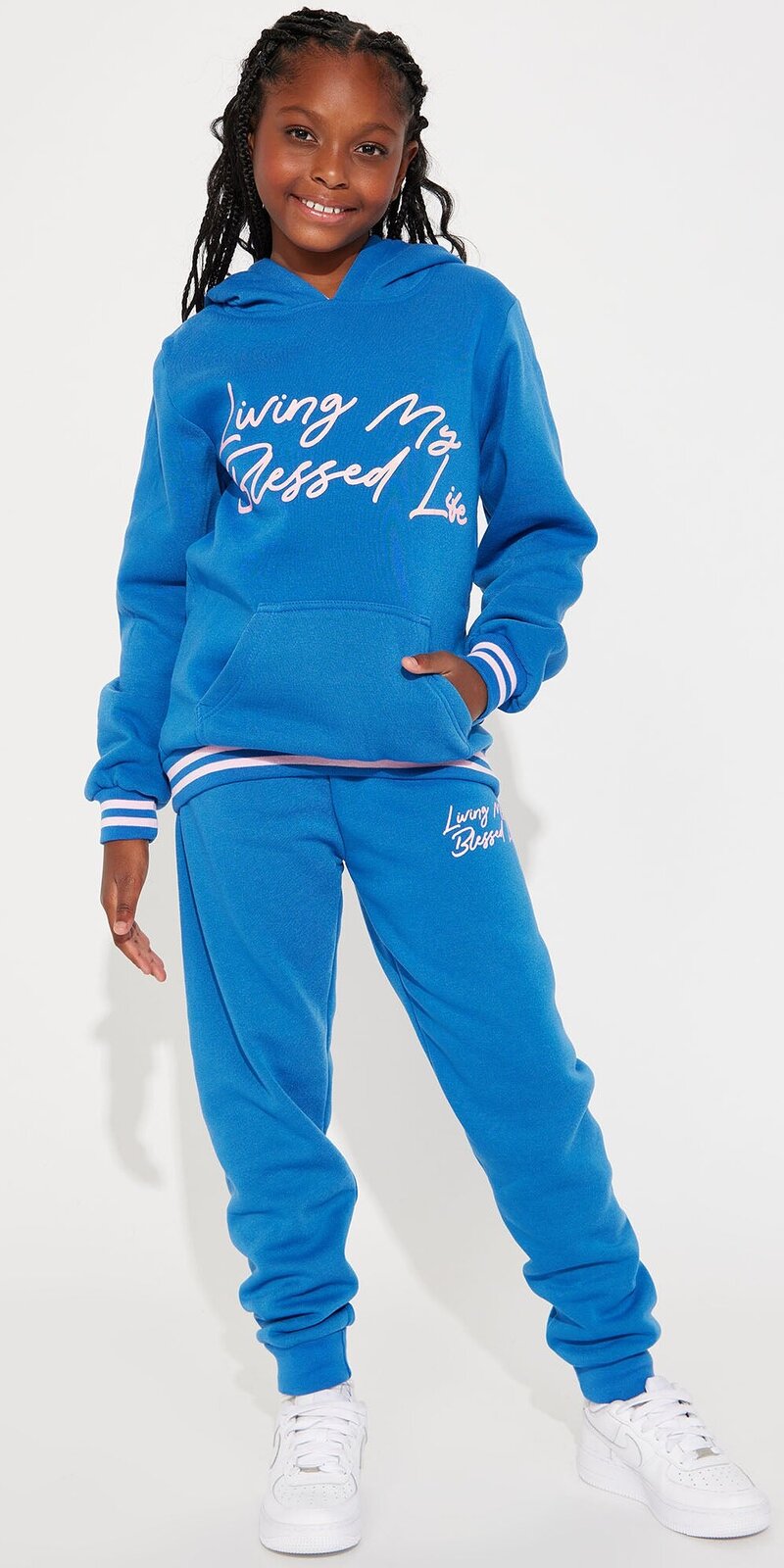 Mäkká detská súprava v modrej farbe z hrejivého fleecu s kapucňou a elastickým pásom. Na prednej strane mikiny nápis „Living My Best Life“. Pohodlný komplet s pružným strihom pre každodenné nosenie.