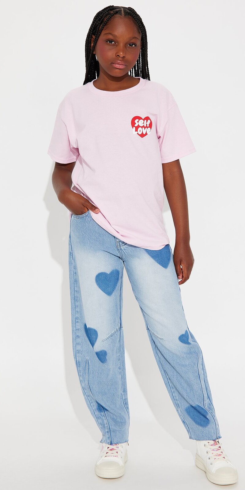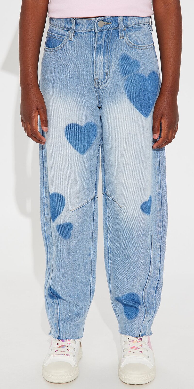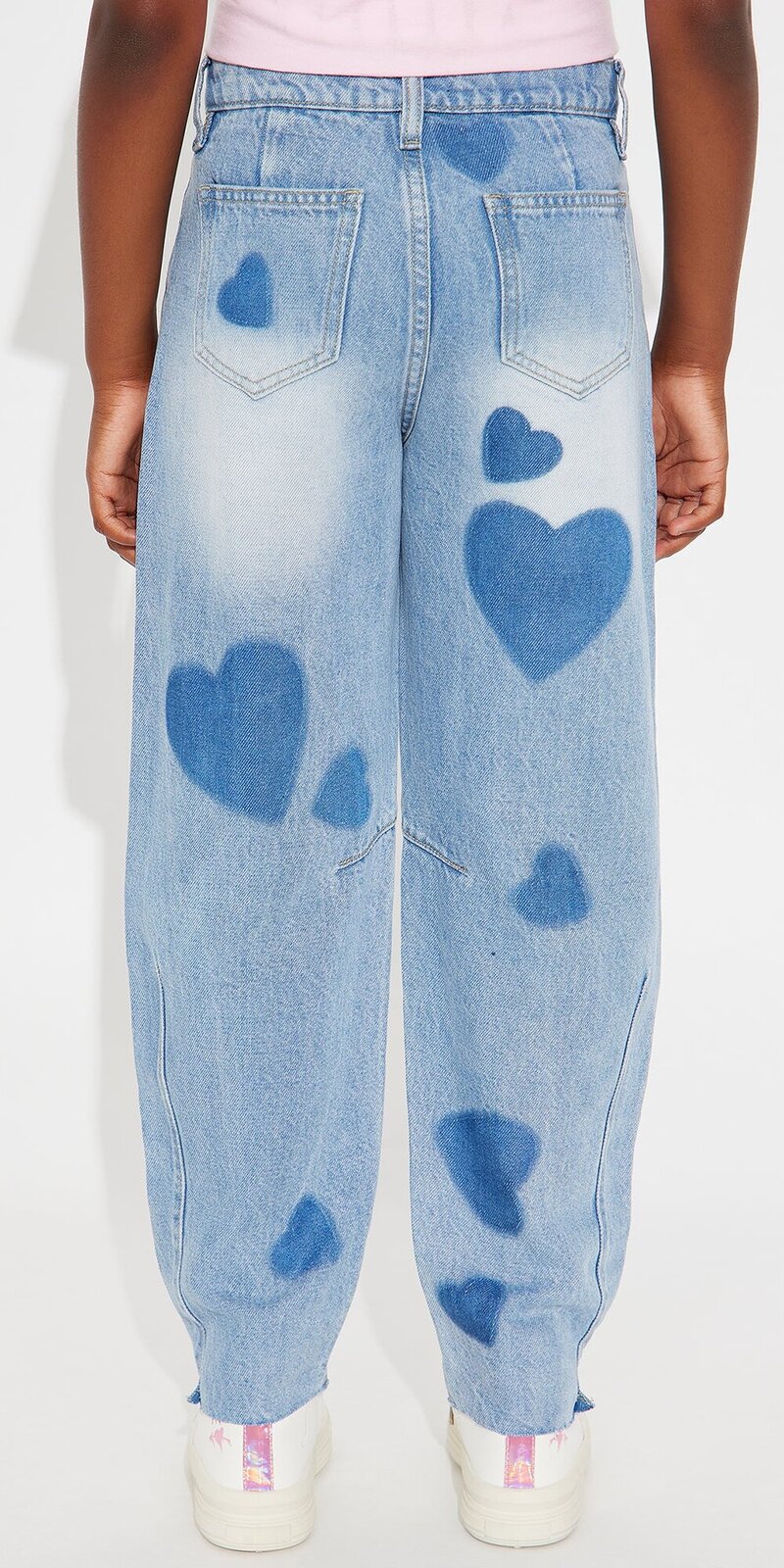 Tieto svetlomodré džínsy s jemnými srdiečkovými detailmi spájajú pohodlie a hravosť v jednom. Ich voľný strih s miernym zúžením nôh vytvára moderný, ležérny vzhľad vhodný na každý deň.