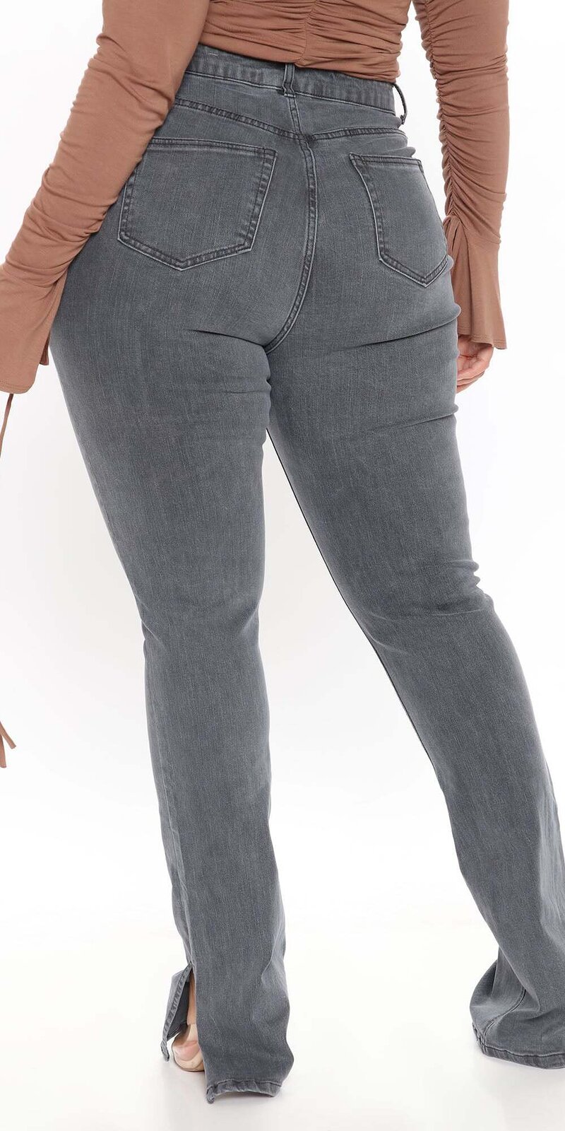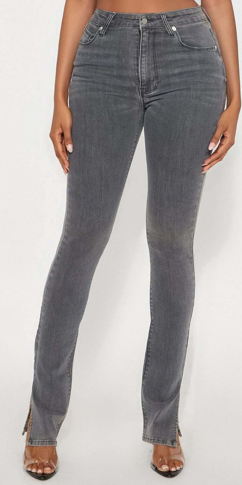 Skinny šedé džínsy s vysokým pásom a rozparkami pri členkoch