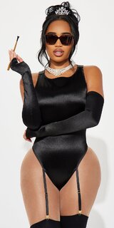 Luxusná čierna kostýmová súprava inšpirovaná ikonickým štýlom s trblietavými detailmi. Obsahuje: body s podväzkami, rukavice, náhrdelník, náušnice, okuliare, ozdobu do vlasov a držiak na cigaretu. Ideálna na tematické večery alebo Halloween.