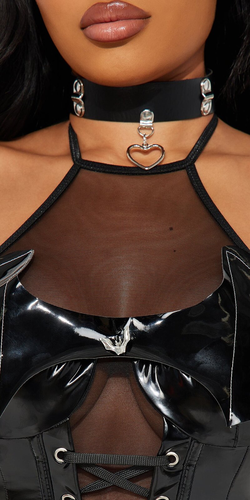 Zvodný čierny trojdielny kostým v štýle netopierej krásky. Obsahuje minišaty s viazaním vpredu, tangá nohavičky a čierny choker. Ideálny outfit na Halloween alebo tematickú párty.