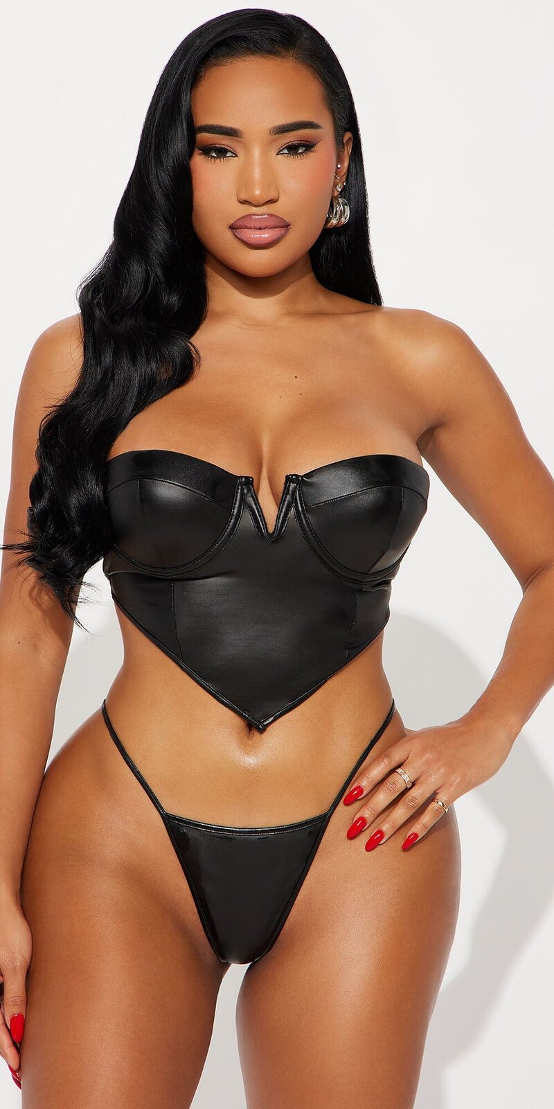 Zvodný dvojdielny set v čiernej farbe pozostáva z bezramienkového korzetového topu a ladiacich tangá nohavičiek. Hladký povrch s koženým efektom pôsobí luxusne, je príjemný na dotyk a vďaka podšívke poskytuje komfort pri nosení.