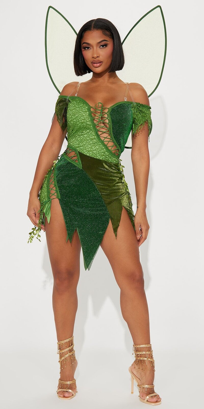 Zvodný zelený kostým v štýle víly s trblietavými detailmi. Súčasťou je patchworkové minišaty s odnímateľnými ramienkami a trblietavé krídla. Ideálny outfit na Halloween alebo tematickú párty.