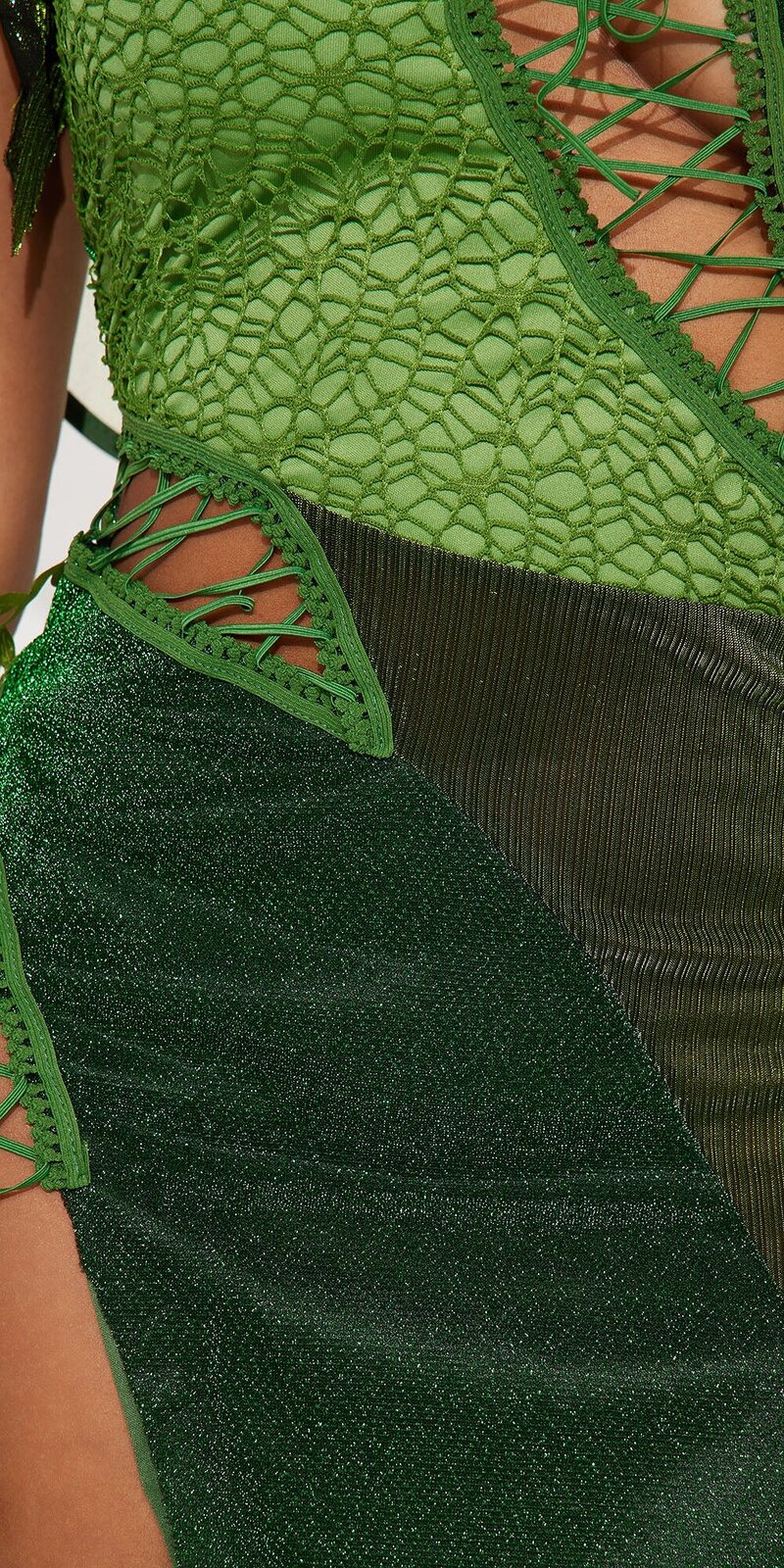Tento zelený kostým Sassy Fairy premení každú ženu na očarujúcu vílu s nádychom hravosti a šarmu. Súprava obsahuje minišaty s patchworkovým efektom a odnímateľnými ramienkami, ktoré umožňujú variabilné nosenie. K outfitu patria aj trblietavé krídla, ktoré dodávajú celému looku magickú atmosféru.
