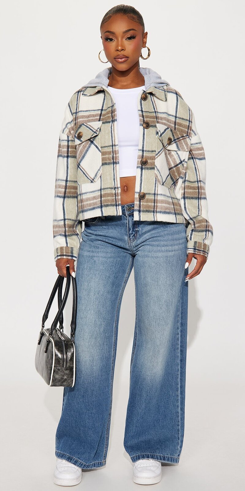 Kockovaná shacket bunda v hnedej kombinácii ponúka pohodlný a štýlový voľnočasový vzhľad s odnímateľnou kapucňou a praktickými vreckami.