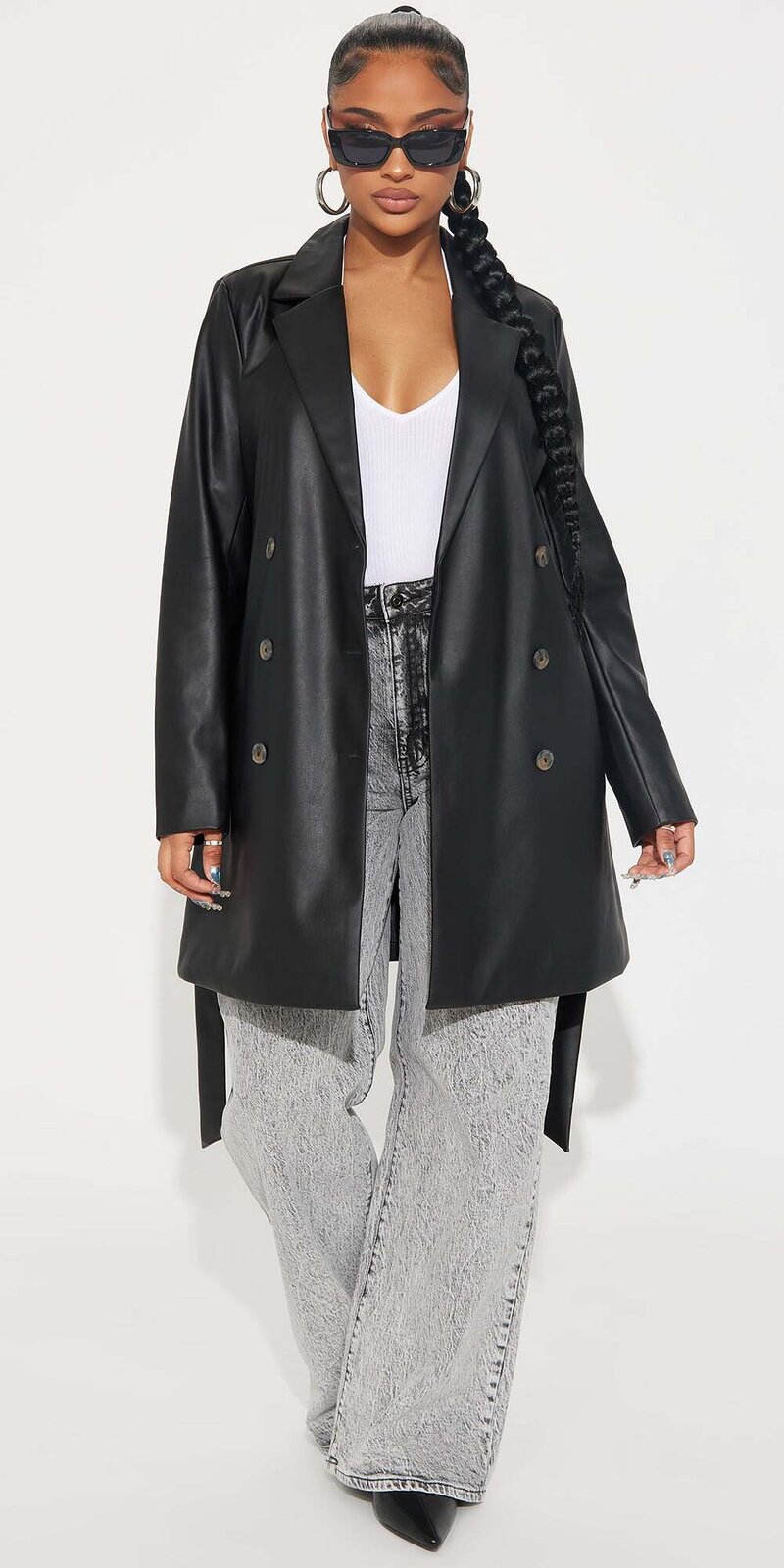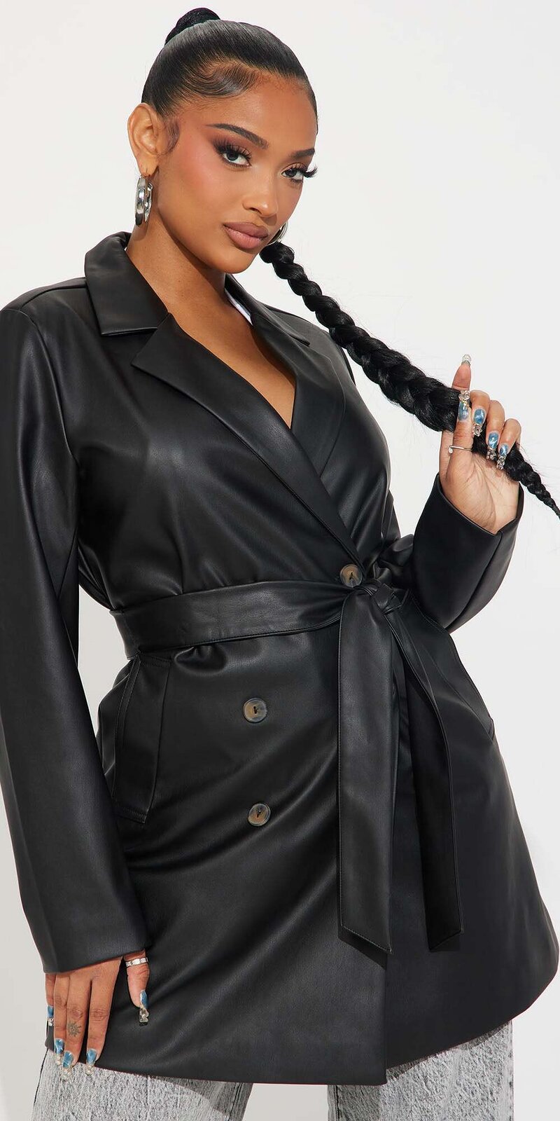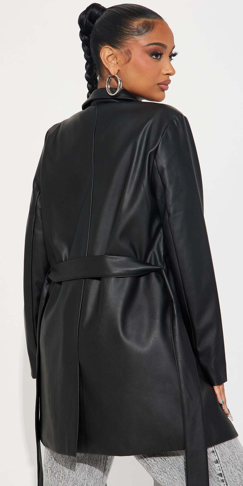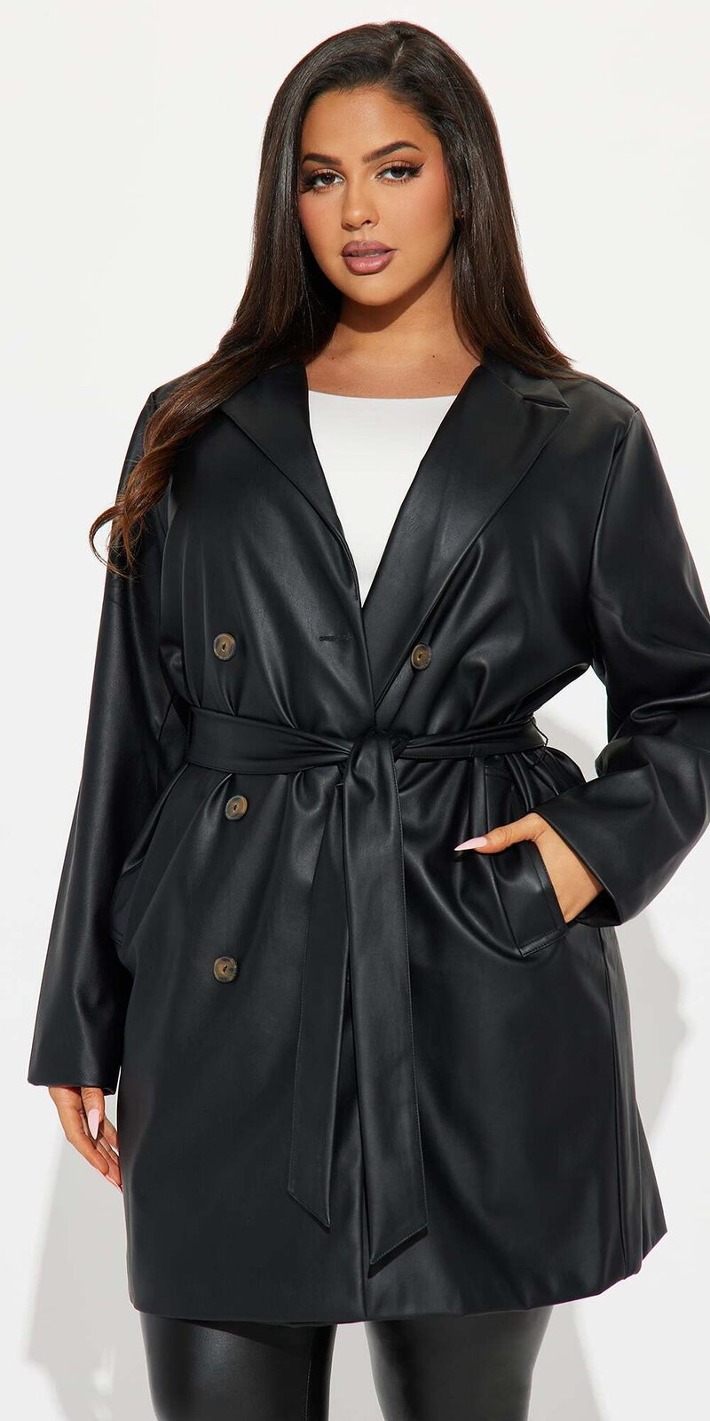 Elegantný čierny kabát z umelej kože s klasickým golierom a zapínaním na gombíky. Opasok zvýrazní pás a dodáva kabátu sofistikovaný vzhľad. Plne podšitý pre komfort.