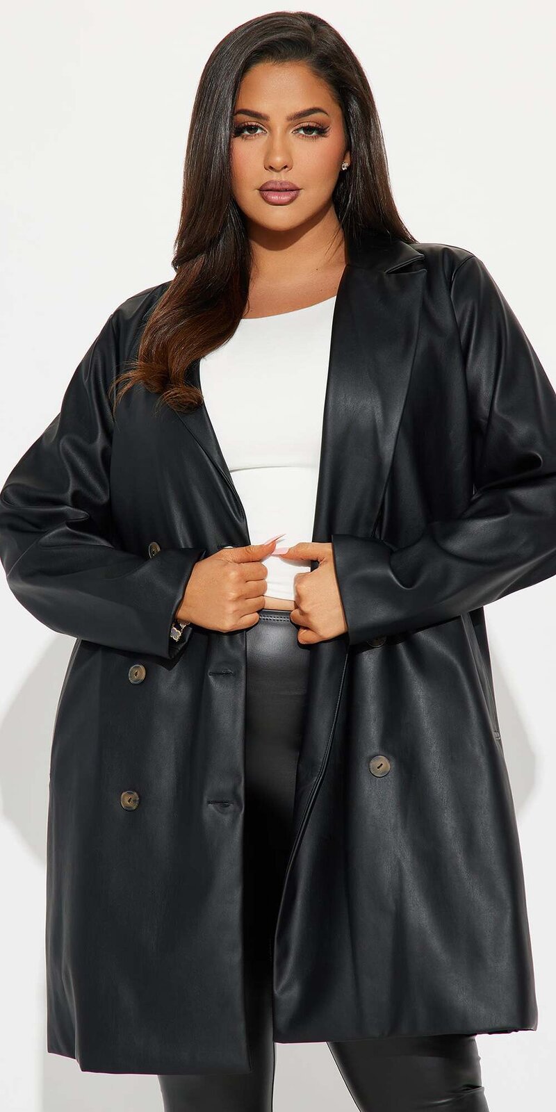 Tento čierny kabát z umelej kože je stelesnením modernej elegancie. Hladký povrch s jemným leskom pôsobí prémiovo, pričom materiál z umelej kože je odolný a príjemný na dotyk.