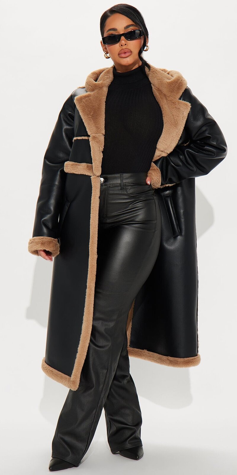 Luxusný trenčkot v kombinácii čiernej a hnedej farby z kvalitnej umelej kože. Model má klasický golier s reverom, dlhé rukávy a hebkú kožušinovú podšívku, ktorá poskytuje výnimočné pohodlie. Plne podšitý interiér a prepracované detaily dodávajú kabátu prémiový charakter.