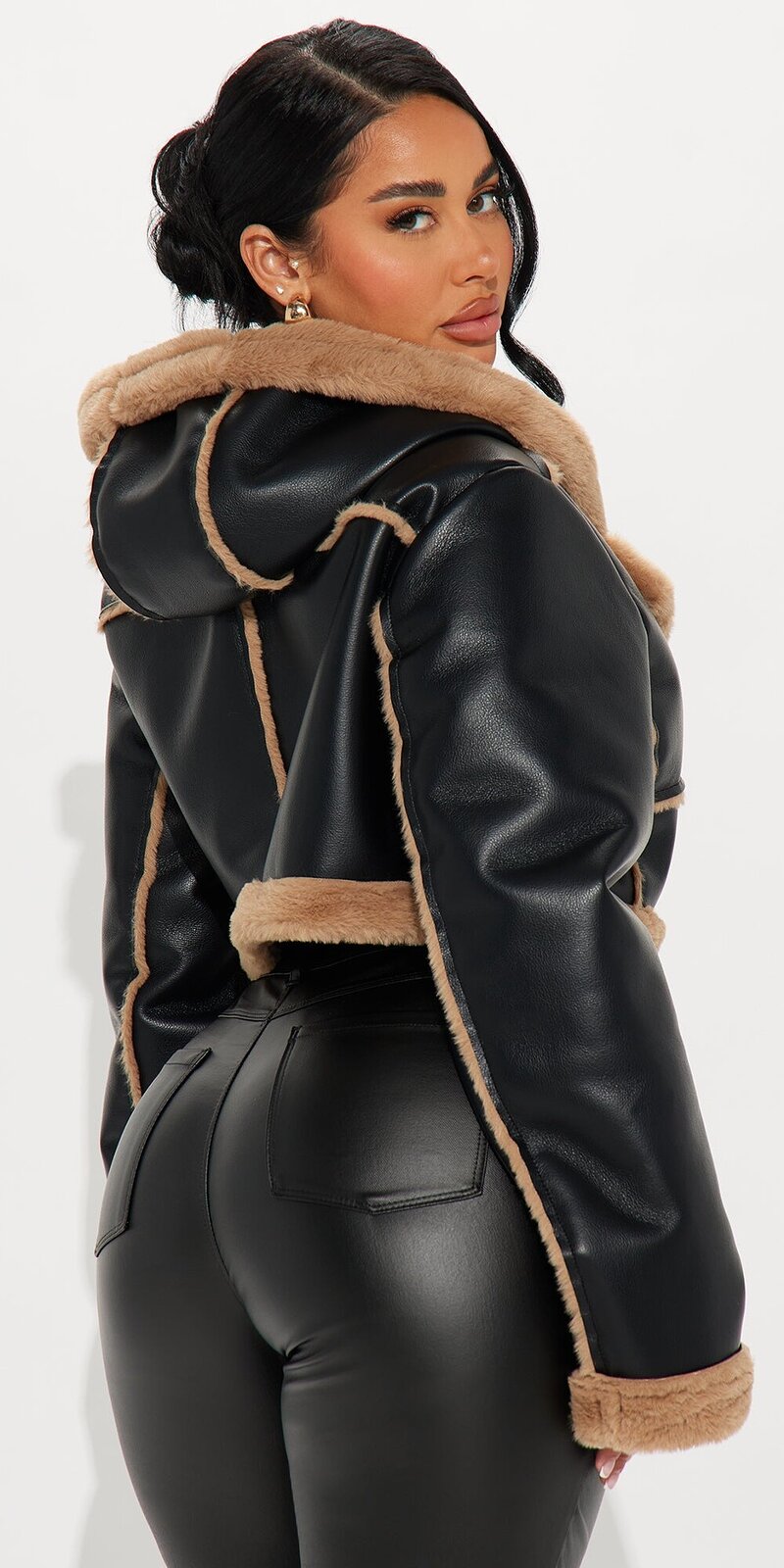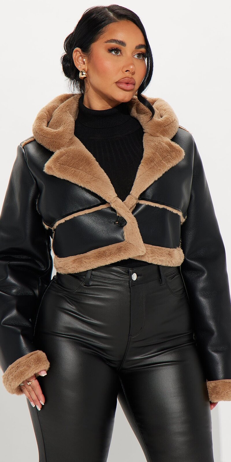 Tento koženkový trenčkot v pôsobivej čiernohnedej kombinácii prináša elegantný a odvážny vzhľad s dôrazom na detail. Hebká kožušinová podšívka vnútri zaručuje výnimočné teplo a komfort aj počas chladných dní.