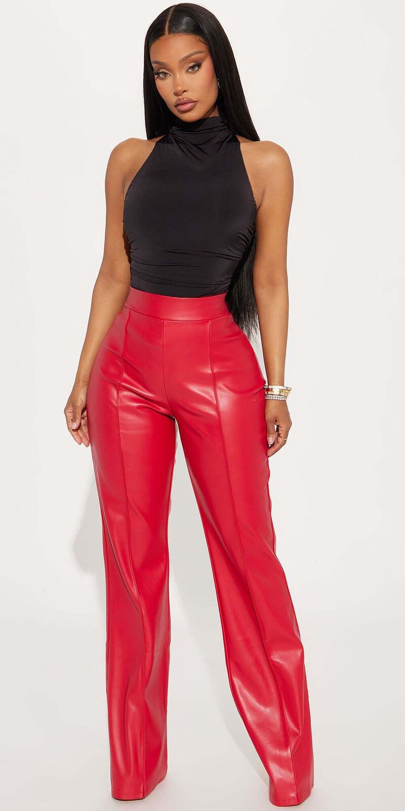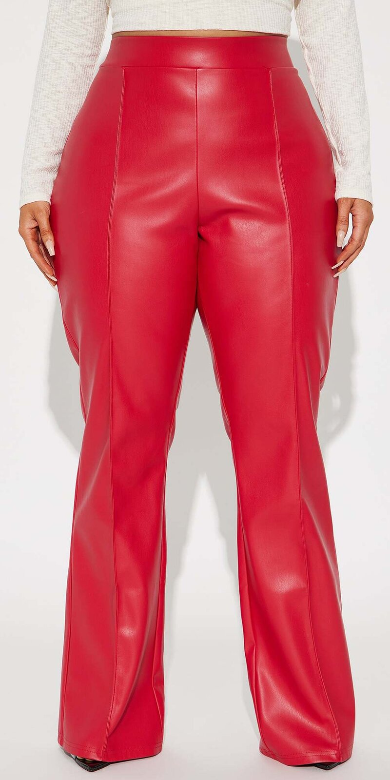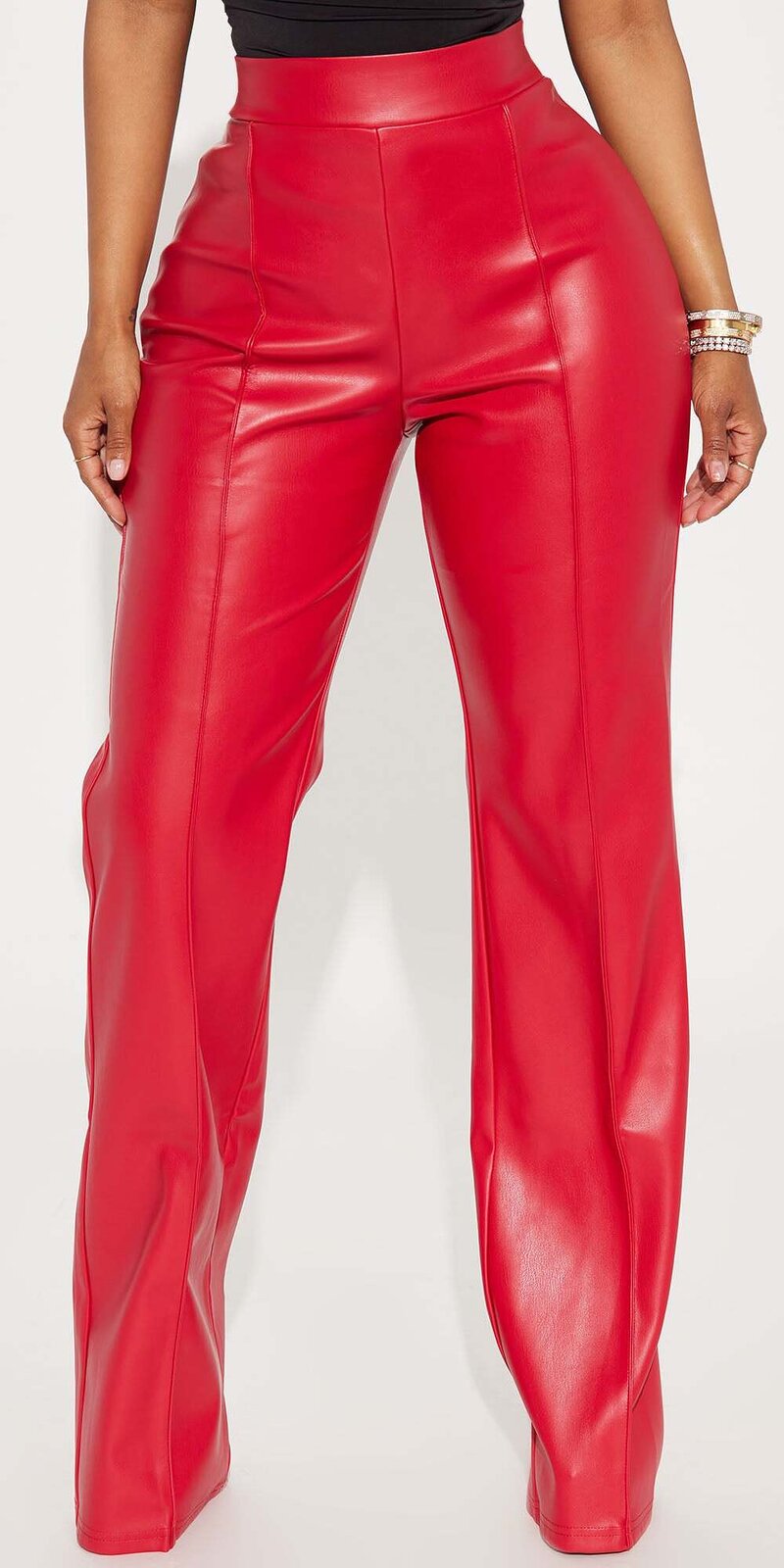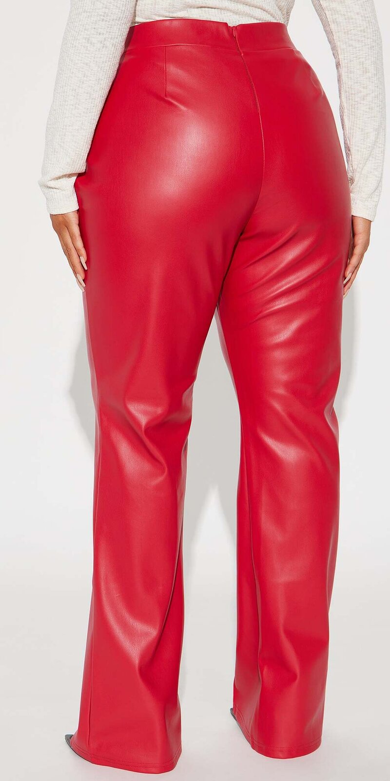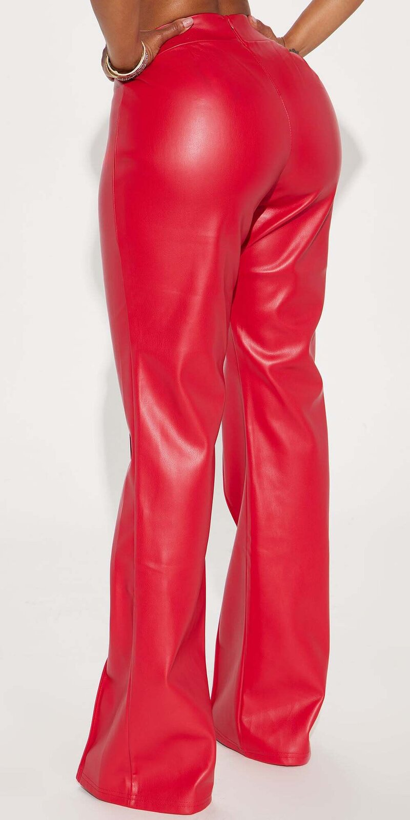 Tieto červené koženkové nohavice sú dokonalým módnym vyhlásením. Vysoký pás krásne predlžuje postavu a dodáva outfitu sofistikovaný charakter.