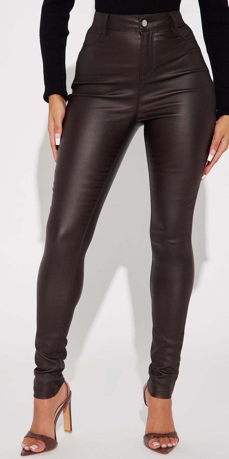 Trendy čokoládové nohavice z umelej kože s vysokým pásom a push up efektom. Úzky skinny strih krásne kopíruje postavu, zatiaľ čo elastická tkanina s povrchovou úpravou dodáva luxusný lesk a prémiový vzhľad.