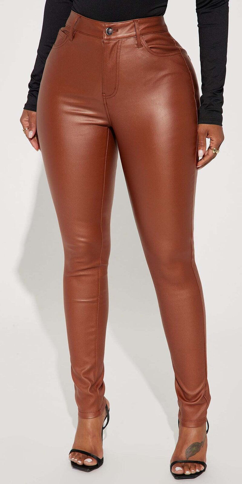 Hnedé dámske koženkové skinny nohavice s vysokým pásom sú odvážnym a elegantným kúskom, ktorý podčiarkne ženské krivky. Vďaka vysokému pásu krásne tvarujú siluetu, zatiaľ čo priliehavý skinny strih opticky predlžuje nohy.