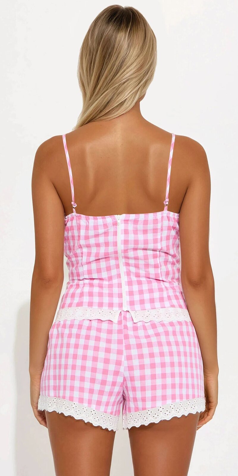 Romantický dvojdielny set v ružovej farbe s jemným károvaným vzorom pôsobí sviežo a žensky. Pevný bavlnený materiál je hladký, príjemný na dotyk a ideálny na teplé dni, pričom top s vystuženými košíkmi krásne tvaruje siluetu.