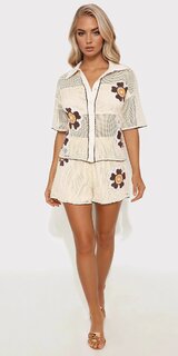 Vzdušný letný set pozostávajúci z košele a kraťasov pôsobí prirodzene, jemne a veľmi štýlovo. Mäkký bavlnený povrch s háčkovanou štruktúrou je príjemný na dotyk, ľahký a komfortný aj počas teplých dní.
