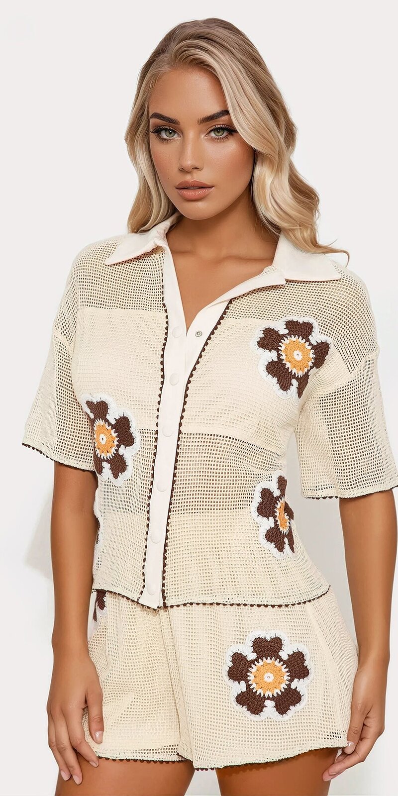 Košeľa s voľným strihom pôsobí vzdušne a štýlovo, zatiaľ čo kraťasy s elastickým pásom zabezpečujú maximálne pohodlie a prirodzené prispôsobenie postave. Háčkovaná štruktúra dodáva celému modelu originálny a remeselne pôsobiaci charakter.