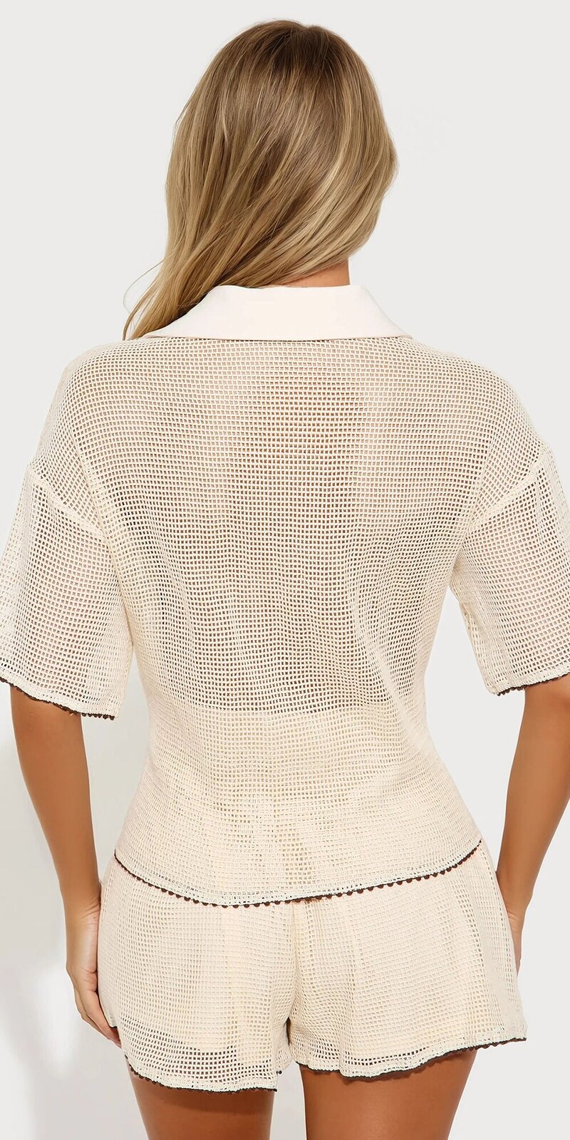 Tento béžový set s háčkovaným vzorom je dokonalým stelesnením uvoľnenej elegancie a letnej pohody. Prírodne pôsobiaci dizajn vytvára jemný, ženský vzhľad s luxusným nádychom, ktorý je ideálny na dovolenkové dni aj mestské prechádzky.