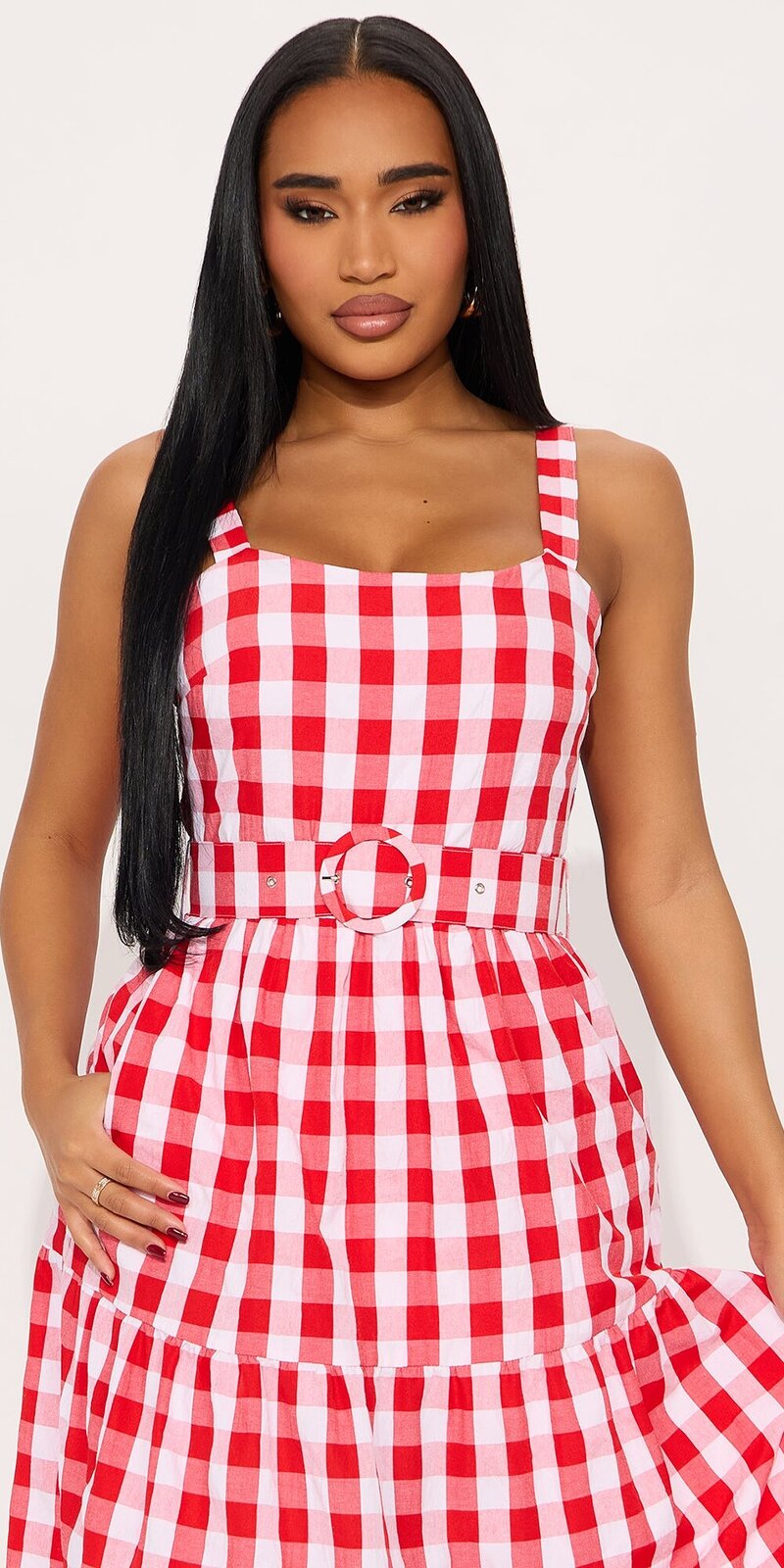 Model má nastaviteľné ramienka a jemné volány v spodnej časti, ktoré pôsobia hravo a vzdušne. Kockovaný vzor v odtieňoch červenej a bielej prináša letnú atmosféru a nadčasový štýl.