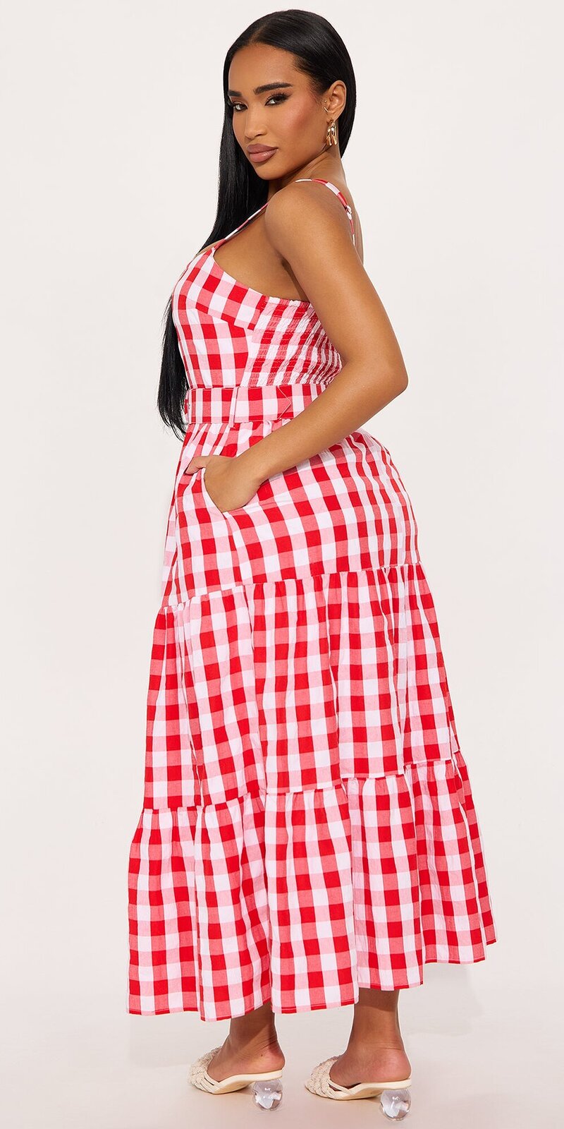 Romantické maxi šaty v červeno-bielom kockovanom vzore s nastaviteľnými ramienkami a opaskom v páse. Mäkký, mierne elastický materiál dopĺňajú jemné volány, ktoré dodávajú šatám ľahkosť a ženský šarm.