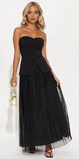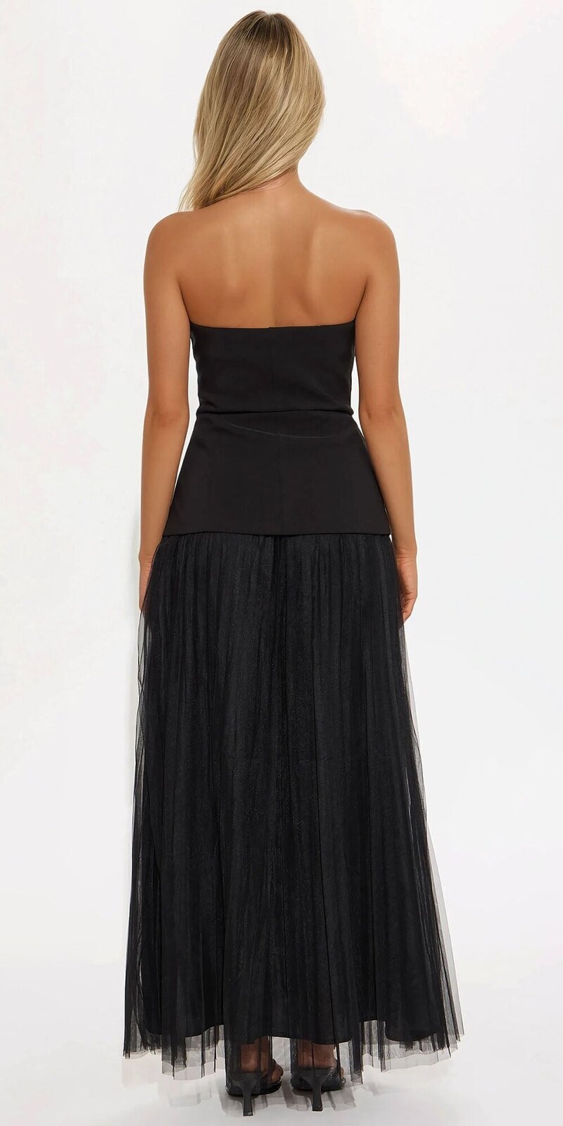 Elegantné maxi šaty v čiernej farbe s rafinovaným korzetovým živôtikom a vzdušnou tylovou sukňou, ktoré pôsobia mimoriadne slávnostne a luxusne. Hladký, pevnejší vrch krásne formuje postavu, zatiaľ čo jemne plisovaný tyl dodáva modelu ľahkosť a noblesný pohyb.